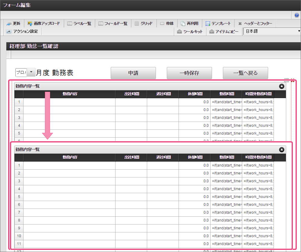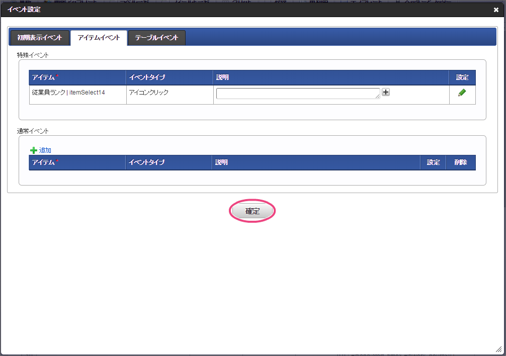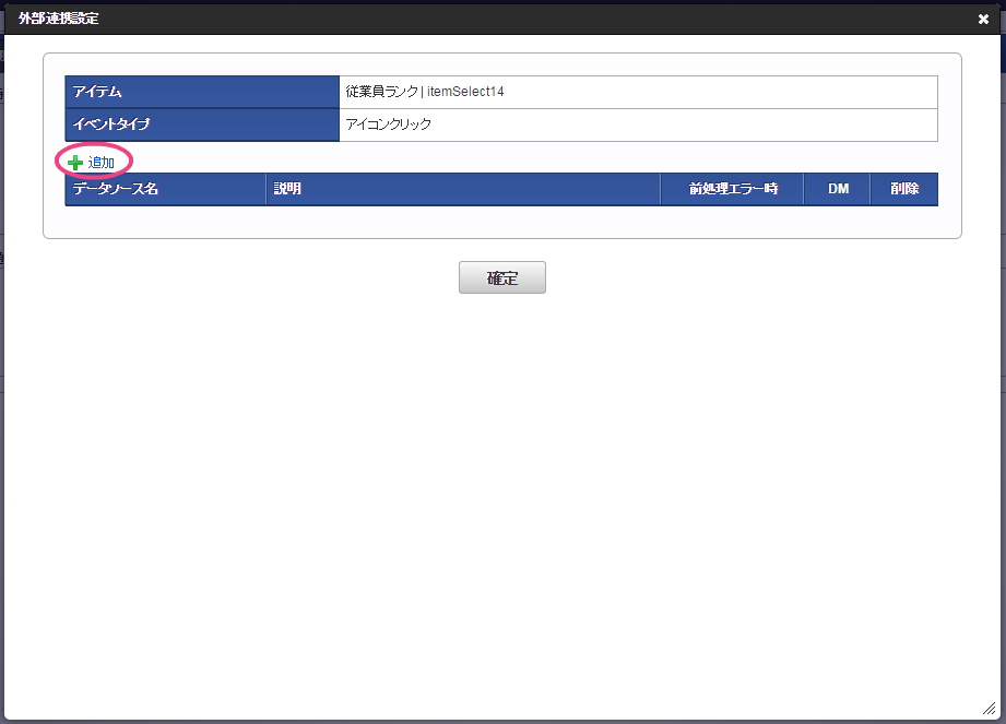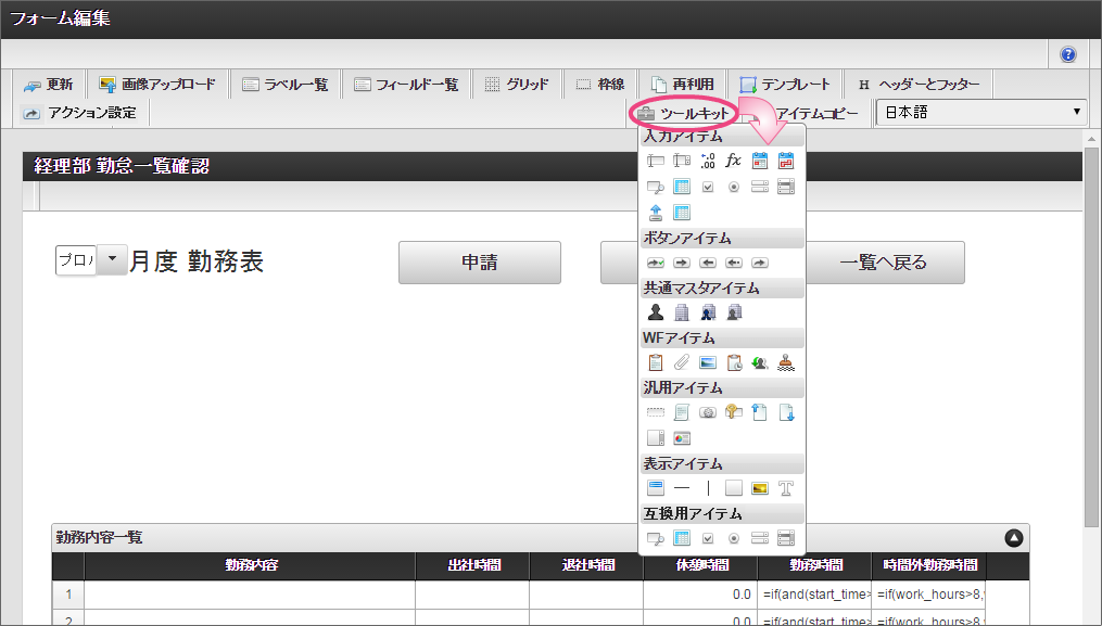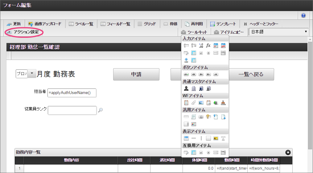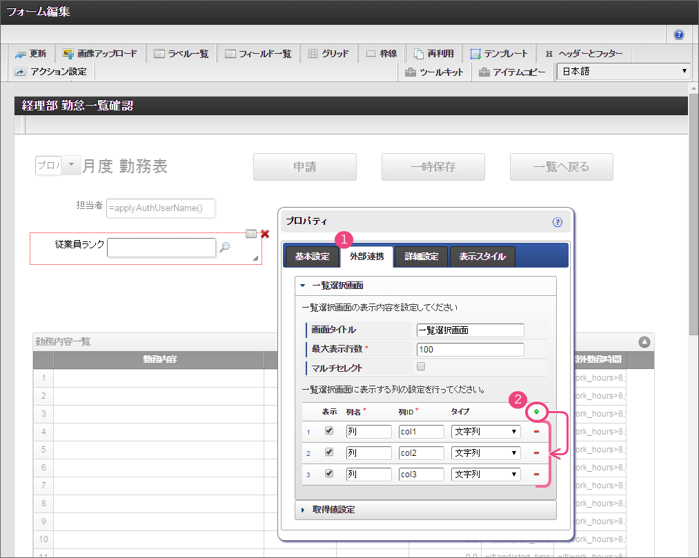 画面の右上の「テンプレート」をクリックして、テンプレート一覧を表示してください。 以下の手順で、登録済みのテンプレートを配置してください。 このように配置できたら、「テンプレート一覧」については、テンプレートをクリックして閉じてください。 経理部用の項目を追加するために、グリッドテーブルをドラッグ&ドロップで下に移動してください。 「ツールキット」をクリックして、ツールキットを表示しましょう。 アイテムの「関数」をドラッグ&ドロップで配置してください。 配置した関数をダブルクリックしてプロパティを表示し、以下の通りに設定してください。設定後、関数のプロパティ画面を閉じてください。 次にツールキットから「一覧選択」をドラッグ&ドロップで配置してください。 配置した一覧選択をダブルクリックしてプロパティを表示し、以下の通りに設定してください。 以下の手順で、「外部連携」を設定してください。 「一覧選択画面」に対し、以下の通りに設定してください。設定後はプロパティ画面を閉じてください。 「アクション設定」をクリックしてください。 以下の手順で「外部連携設定」画面を表示してください。 「追加」をクリックしてください。