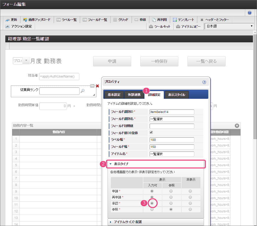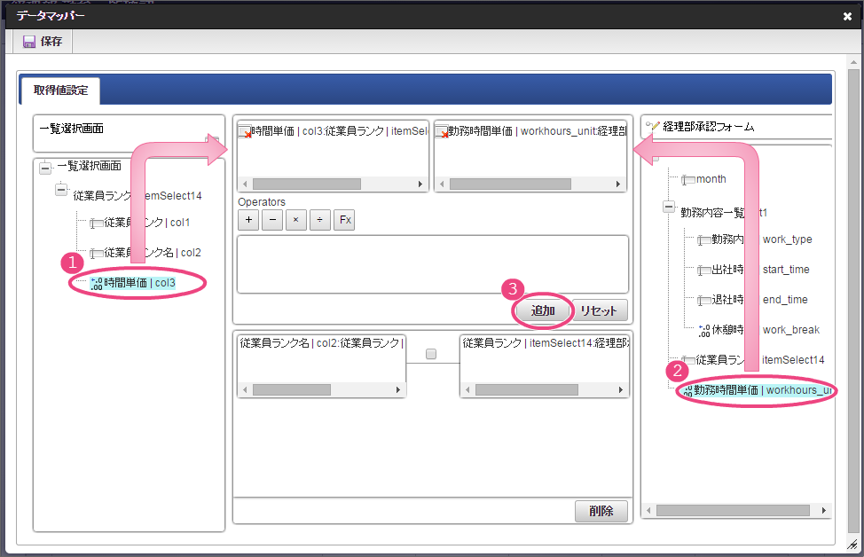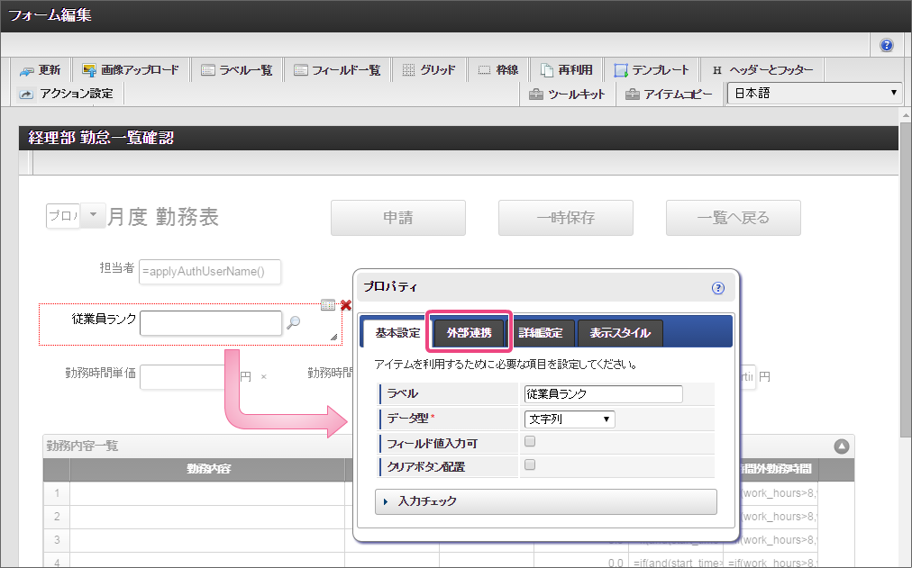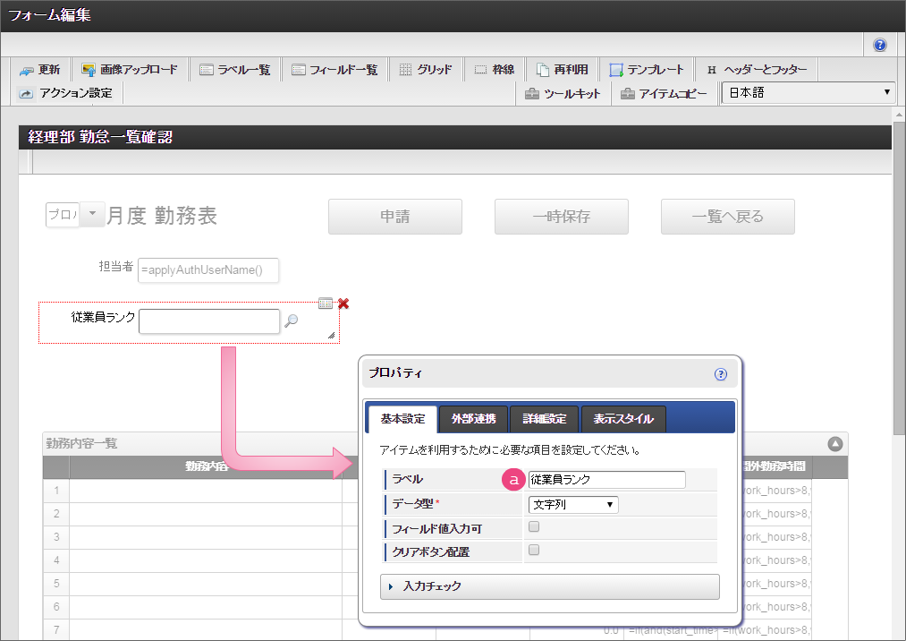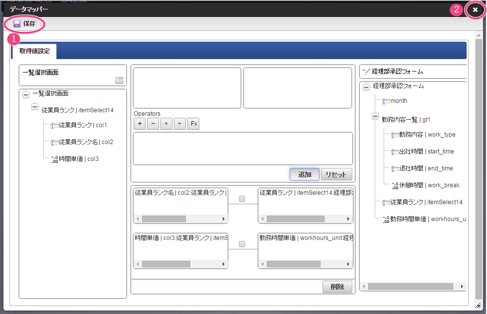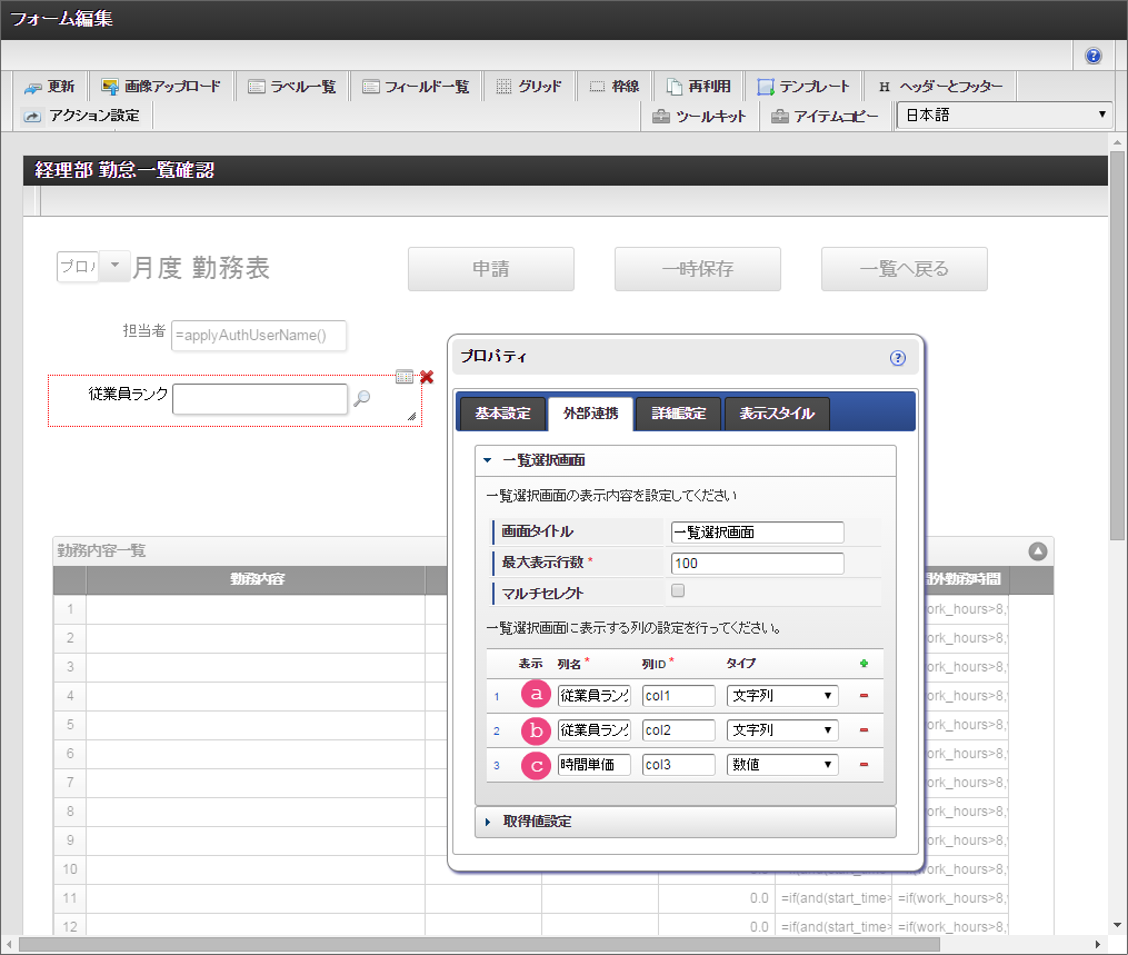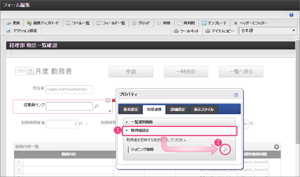 設定項目 設定値 f 最大入力値 9999999 以下の手順でレイアウトを調整してください。 一覧選択をダブルクリックしてプロパティを表示し、「外部連携」をクリックしてください。 「外部連携」では、以下の手順で「取得値設定」画面を表示してください。 以下の手順で、「従業員ランク名」のマッピングを設定してください。 以下の手順で、「時間単価」のマッピングを設定してください。 これで一覧画面から従業員ランクと時間単価を検索して入力するための連携が設定できました。以下の手順でマッピングの設定を終了してください。 引き続き、以下の手順で表示タイプを設定してください。設定したら、プロパティの外側をクリックして、プロパティを閉じてください。 経理部承認画面では、一時保存機能を利用しないため、以下の手順で削除してください。 これで経理部画面の設定がすべてできましたので、「更新」をクリックして保存してください。保存できたらフォーム編集画面を右上の「」で閉じてください。