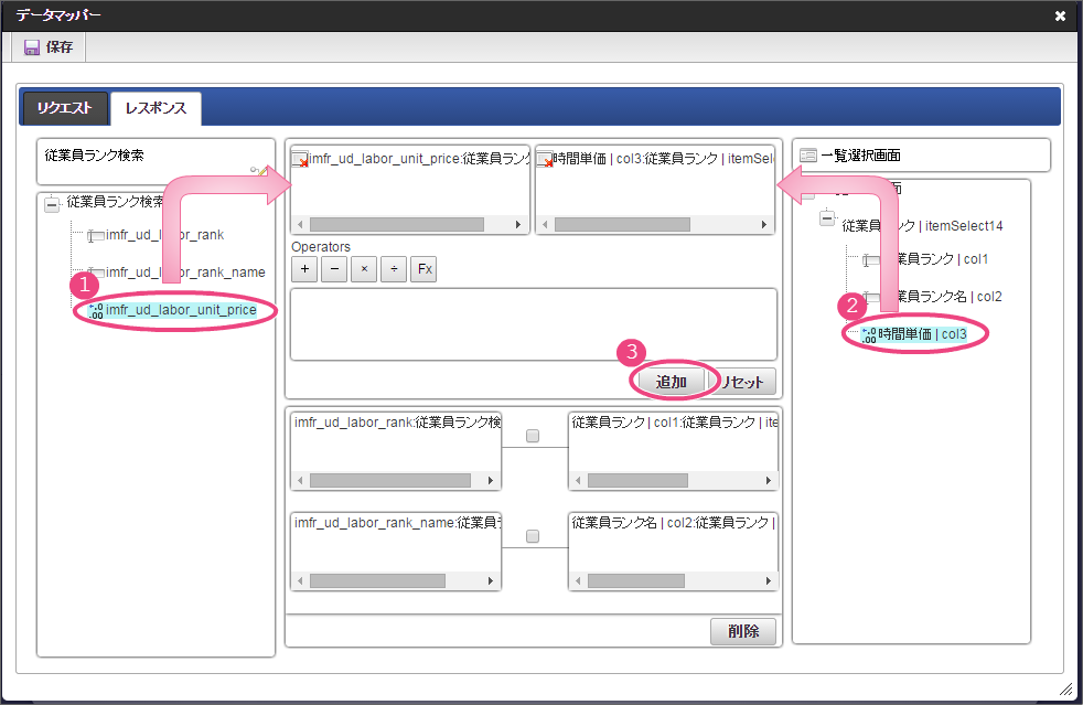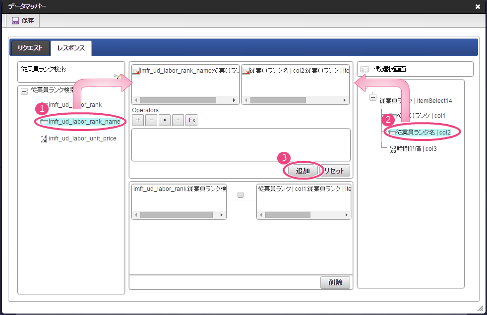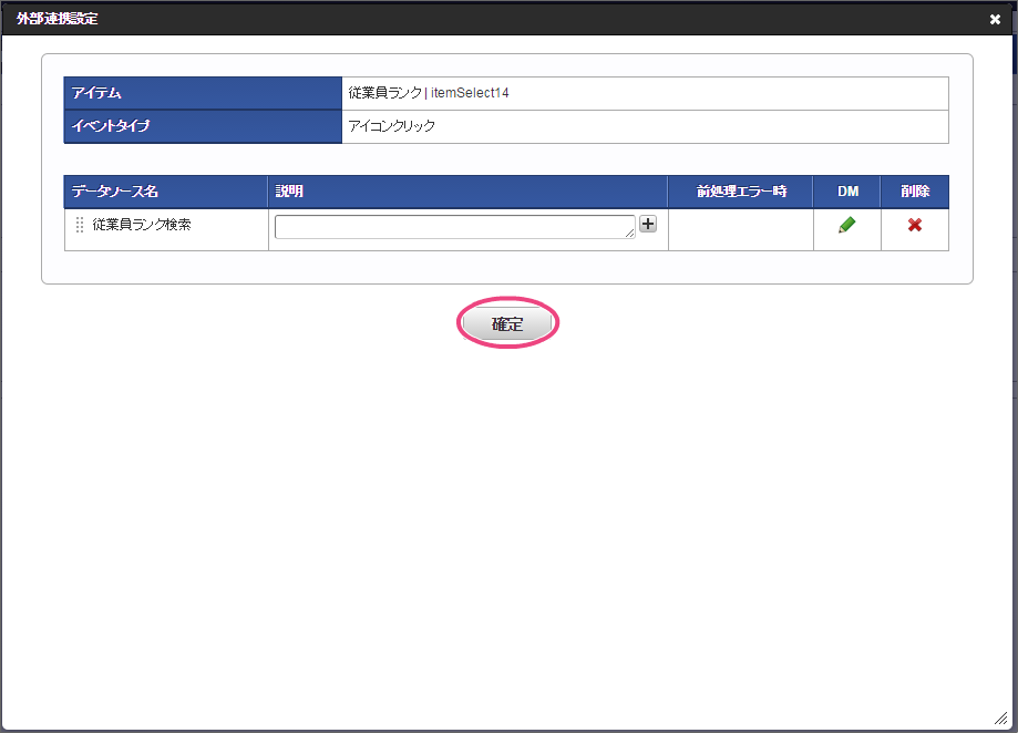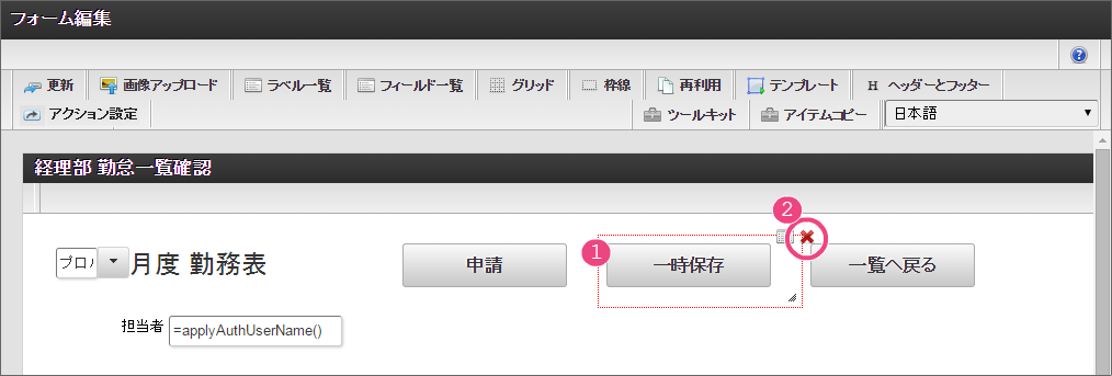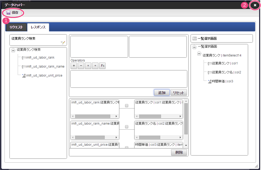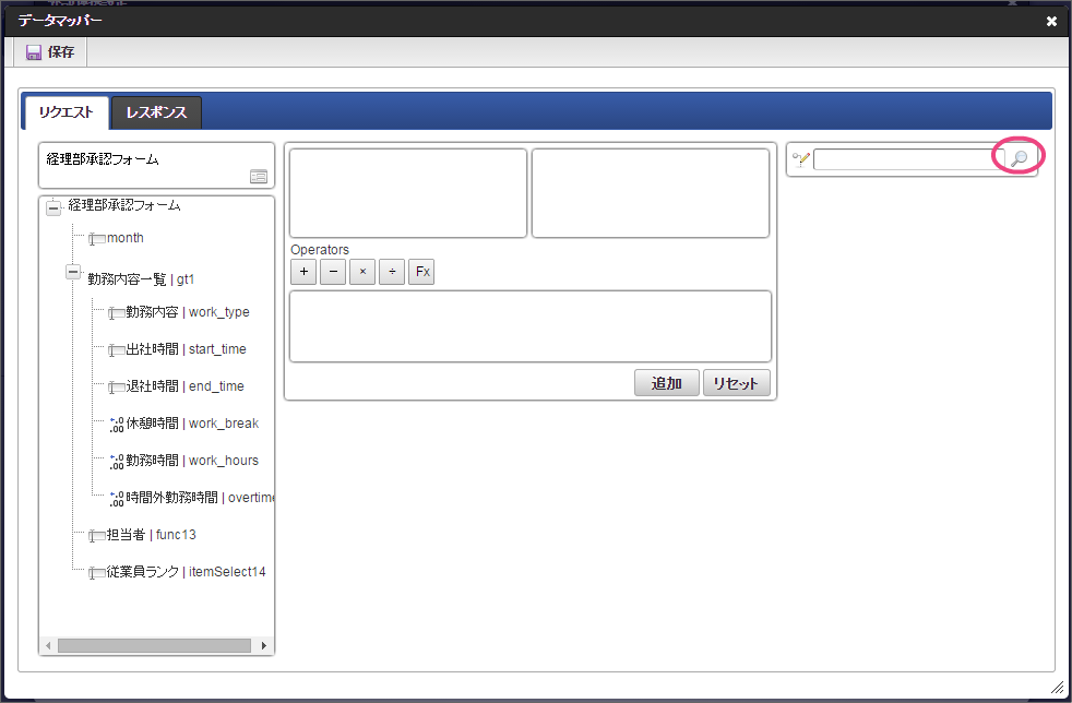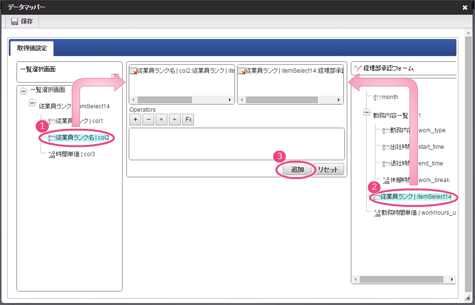設定項目 設定値 f 最大入力値 9999999 以下の手順でレイアウトを調整してください。 一覧選択をダブルクリックしてプロパティを表示し、「外部連携」をクリックしてください。 「外部連携」では、以下の手順で「取得値設定」画面を表示してください。 以下の手順で、「従業員ランク名」のマッピングを設定してください。 以下の手順で、「時間単価」のマッピングを設定してください。 これで一覧画面から従業員ランクと時間単価を検索して入力するための連携が設定できました。以下の手順でマッピングの設定を終了してください。 引き続き、以下の手順で表示タイプを設定してください。設定したら、プロパティの外側をクリックして、プロパティを閉じてください。 経理部承認画面では、一時保存機能を利用しないため、以下の手順で削除してください。 これで経理部画面の設定がすべてできましたので、「更新」をクリックして保存してください。保存できたらフォーム編集画面を右上の「」で閉じてください。
