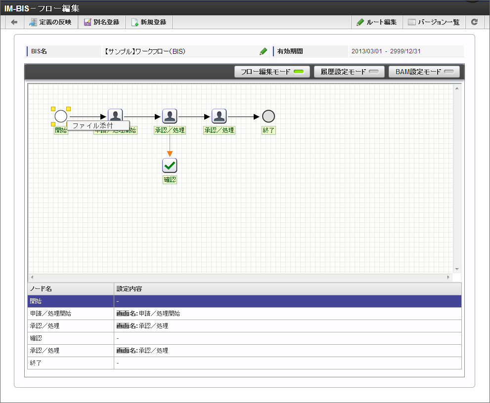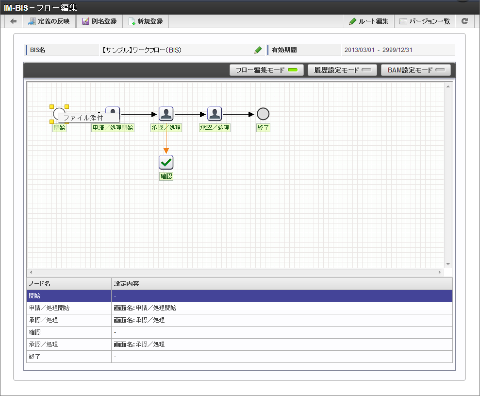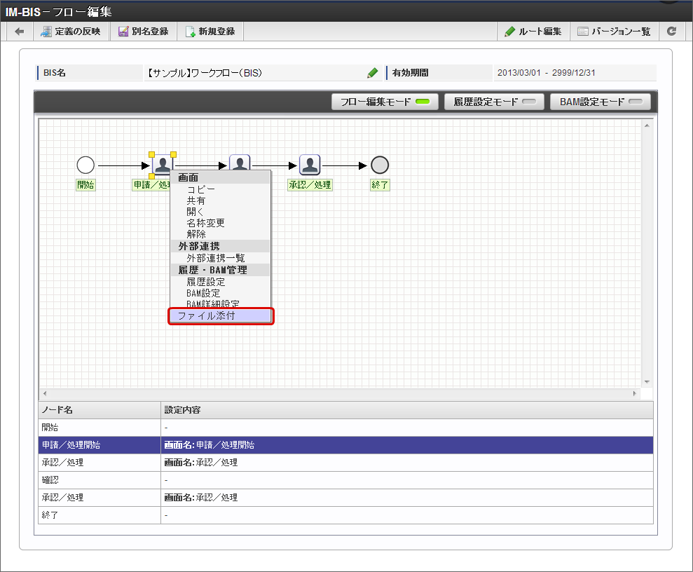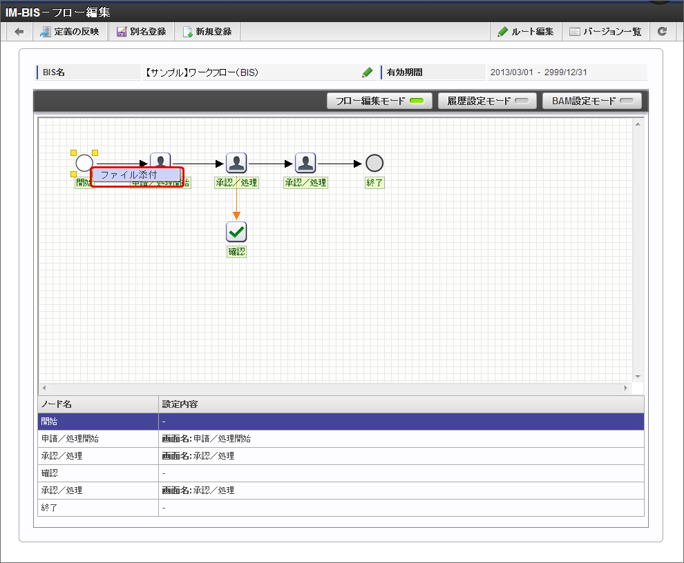 IM-BIS で作成したフローやノードに対して、対応する社内規程の資料などフローの定義に関わるファイルを添付することができます。この機能で追加したファイルは、「フロー編集」画面から自由にアップロード、ダウンロードすることができます。コラム