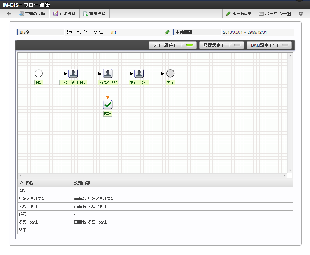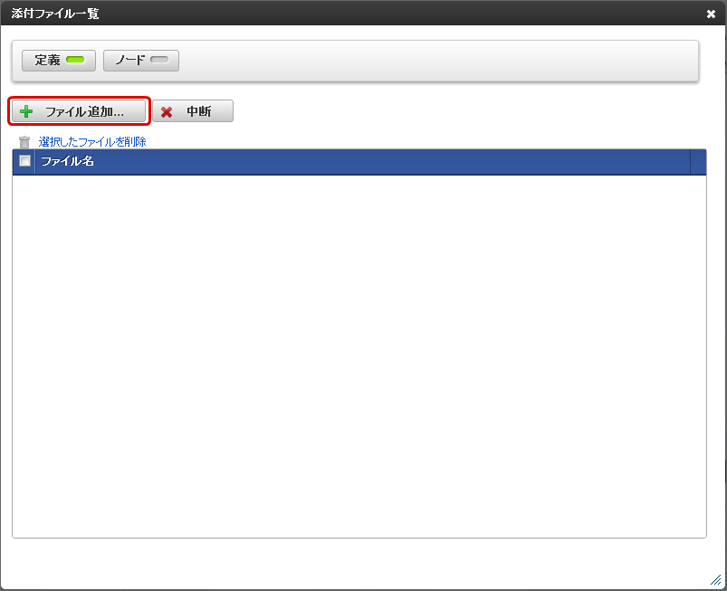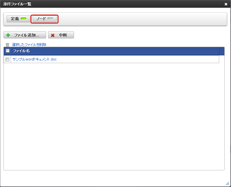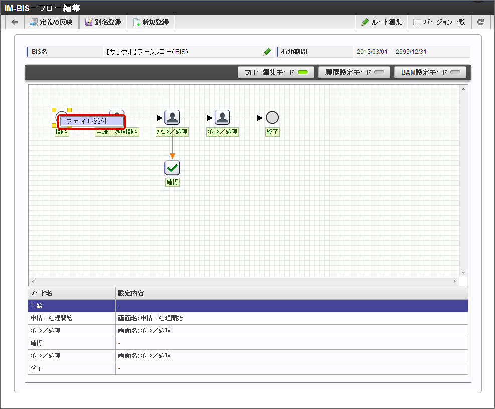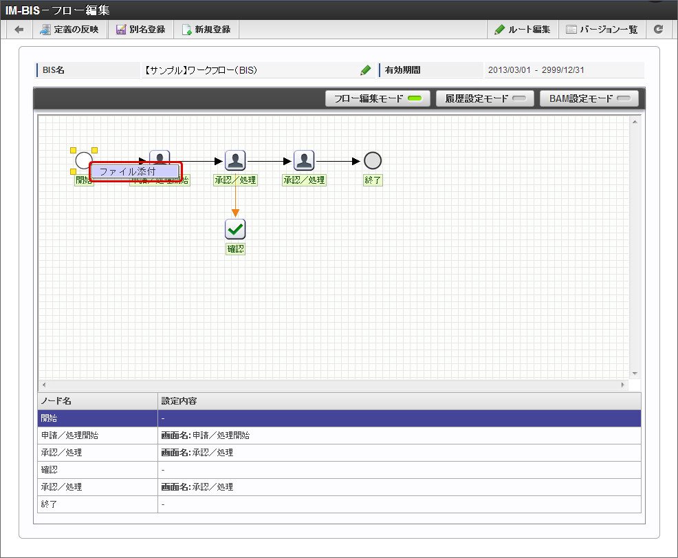 IM-BIS で作成したフローやノードに対して、対応する社内規程の資料などフローの定義に関わるファイルを添付することができます。この機能で追加したファイルは、「フロー編集」画面から自由にアップロード、ダウンロードすることができます。コラム