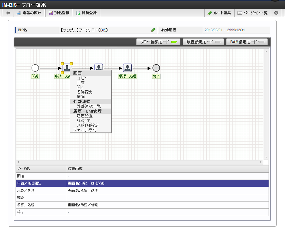 設計文書管理機能を利用すると、BISのフローやノードに、設定書や設定手順書などのファイルを添付することができます。