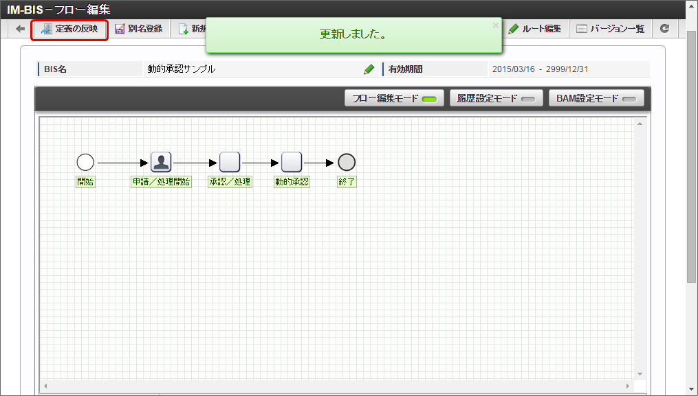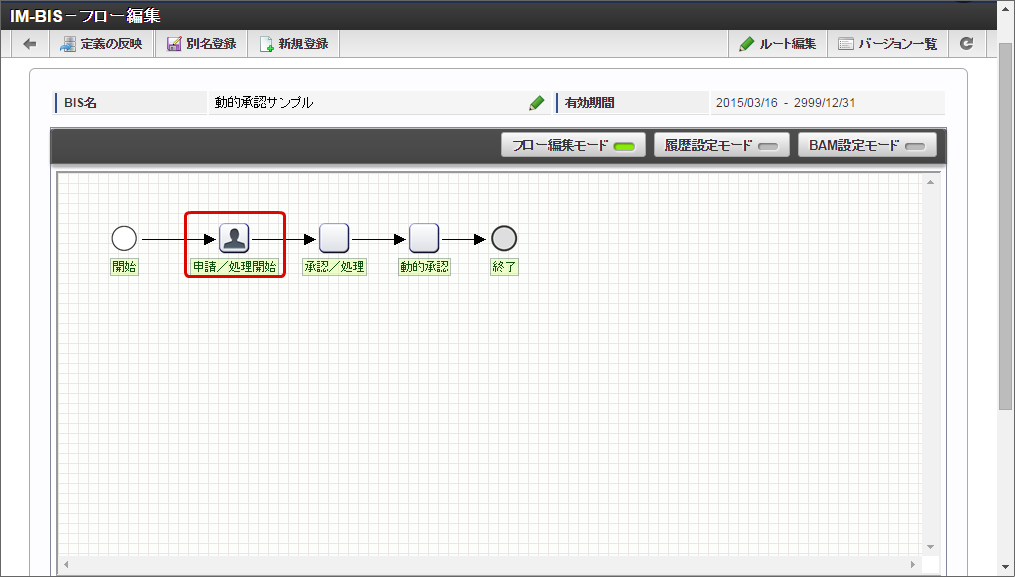 「 IM-BIS の基本的な設定 」を参考に、動的ノードの処理対象者を決定するタスク(ノード)の画面を設定します。この手順では、「申請/処理開始」ノードのタイミングで、動的ノードの処理対象者を決定する設定を例にして進めていきます。画面が設定できたら、「定義の反映」を実行します。