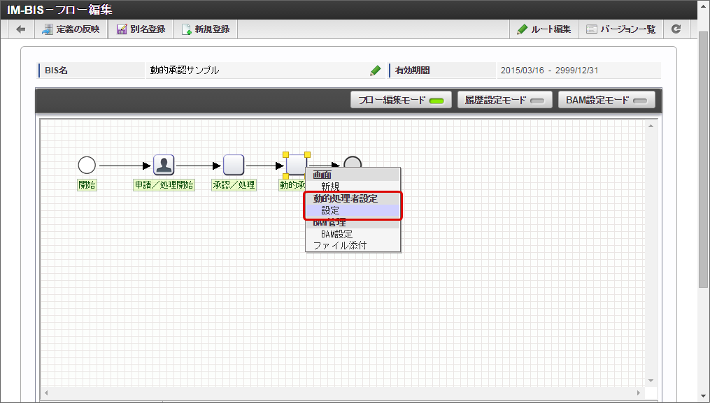 「IM-BIS - フロー編集」画面の「動的承認」ノードの上で右クリックし、「動的処理者設定」の「設定」をクリックします。