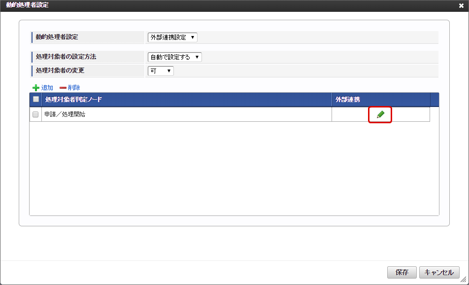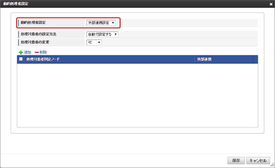 「動的処理者設定」画面の動的処理者設定に「外部連携設定」を選択します。