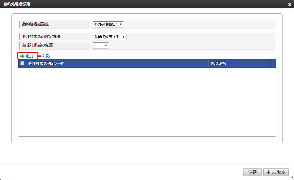 - 動的処理者設定で外部連携を設定する場合にはデータソース定義が必要です。動的処理者設定に関するデータソース定義の仕様については「 IM-BIS 仕様書 」-「 動的処理対象者設定に関する仕様 」を参照してください。