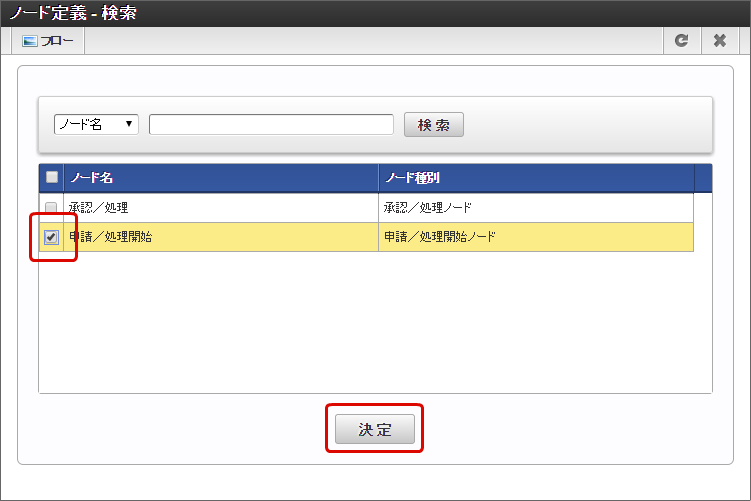 「ノード定義 - 検索」画面で対象ノードにチェックを入れて、「決定」をクリックします。