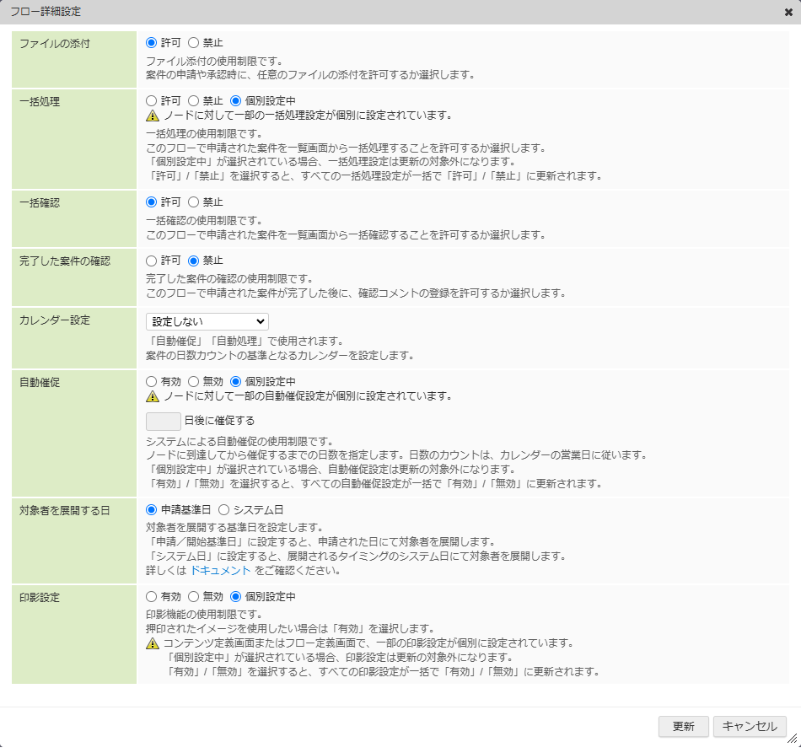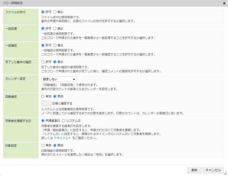 「フロー詳細設定」では、ワークフローに関連する機能の有効・無効などを変更できます。