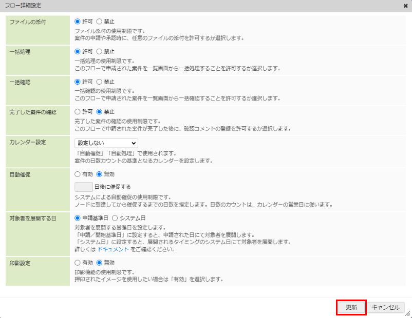 ファイルの添付ファイル添付の使用制限です。案件の申請や承認時に、任意のファイルの添付を許可するか選択します。初期状態は「許可」です。「禁止」に設定すると、このフローで申請された案件ではファイルの添付を一切行うことはできません。ただし、「禁止」を選択しても「フォーム編集」画面で設定したファイルの添付機能は制限されません。 一括処理一括処理の使用制限です。このフローで申請された案件を一覧画面から一括処理することを許可するか選択します。初期状態は「許可」です。「禁止」に設定すると、このフローで申請された案件の一括処理を行うことはできません。 一括確認一括確認の使用制限です。このフローで申請された案件を一覧画面から一括確認することを許可するか選択します。初期状態は「許可」です。「禁止」に設定すると、このフローで申請された案件の一括確認を行うことはできません。 完了した案件の確認完了した案件の確認の使用制限です。このフローで申請された案件が完了した後に、確認コメントの登録を許可するか選択します。初期状態は「禁止」です。「禁止」に設定すると、このフローで申請された案件が完了した後は、確認コメントを登録できません。 カレンダー設定カレンダーの設定です。自動催促、自動処理で使用されます。案件の日数カウントの基準となるカレンダーを設定します。テナント管理者が登録済みのカレンダー定義が一覧表示されます。初期状態は「設定しない」です。「設定しない」に設定すると、全ての日を1日としてカウントします。 自動催促システムによる自動催促の使用制限です。有効にした場合、ノードに到達してから催促するまでの日数を指定する必要があります。設定した日数が経過してもノードの処理がされなかった場合、ノードの処理対象者にシステムから催促メッセージ、メール、IMBoxが配信されます。催促までの日数のカウントはシステムに設定されたカレンダーの営業日に従い、休日を経過日数のカウント対象外とします。初期状態は「無効」です。 「有効」とする場合、ノードに到達してから催促するまでの日数を指定するための設定項目が表示されます。 対象者を展開する日対象者を展開する際に基準とする日を設定します。案件処理中にノードに到達すると、ワークフローはノードに設定している処理対象に従い、対象者を展開します。展開されたユーザは本人としての処理権限を持ち、ノードの処理を行うことができます。「申請/開始基準日」に設定すると、申請された日にて対象者を展開します。「システム日」に設定すると、展開されるタイミングのシステム日にて対象者を展開します。初期状態は「申請基準日」です。 印影設定印影設定の使用制限です。このフローで申請された案件に対して押印されたイメージの使用を許可するか選択します。初期状態は「無効」です。また、IM-Workflow の印影機能は標準では「使用しない」に設定されています。この設定の場合、印影設定機能は表示されません。使用するにはテナント単位設定の印影の使用可否設定を変更する必要があります。