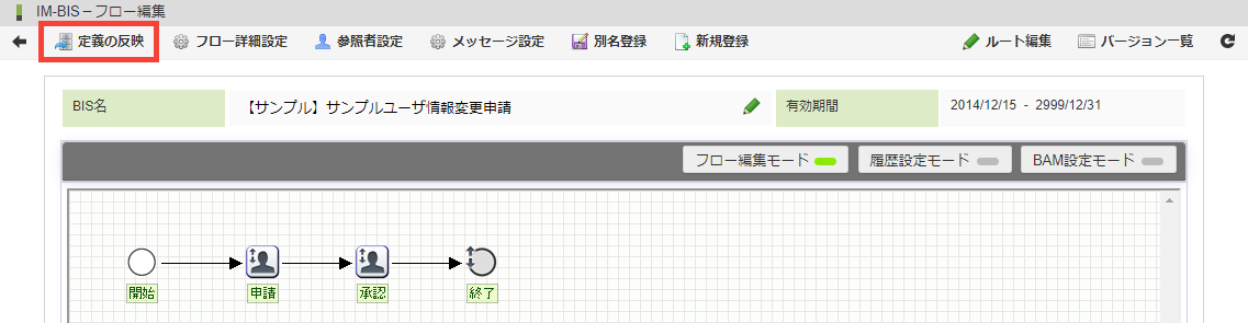 最後に「定義の反映」をクリックしたら、「フロー詳細設定」の変更は完了です。