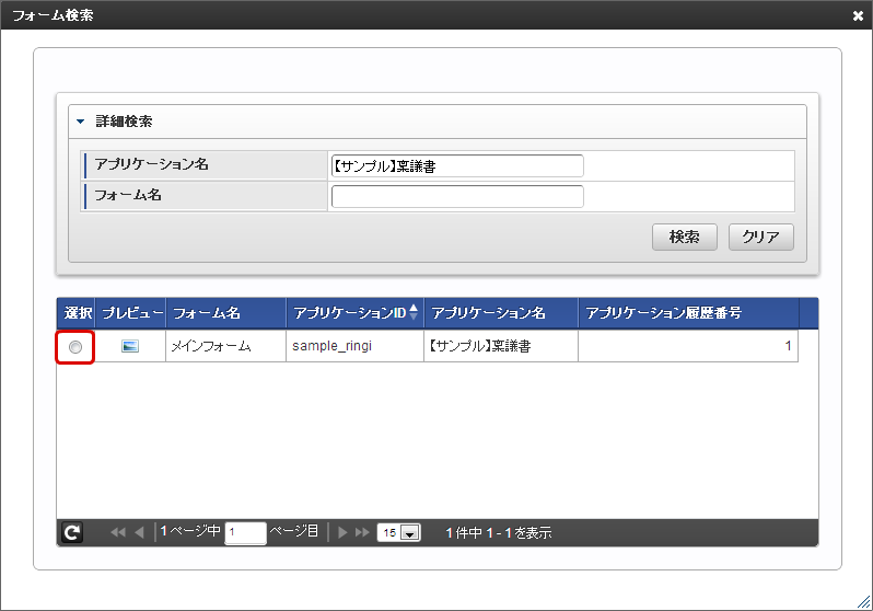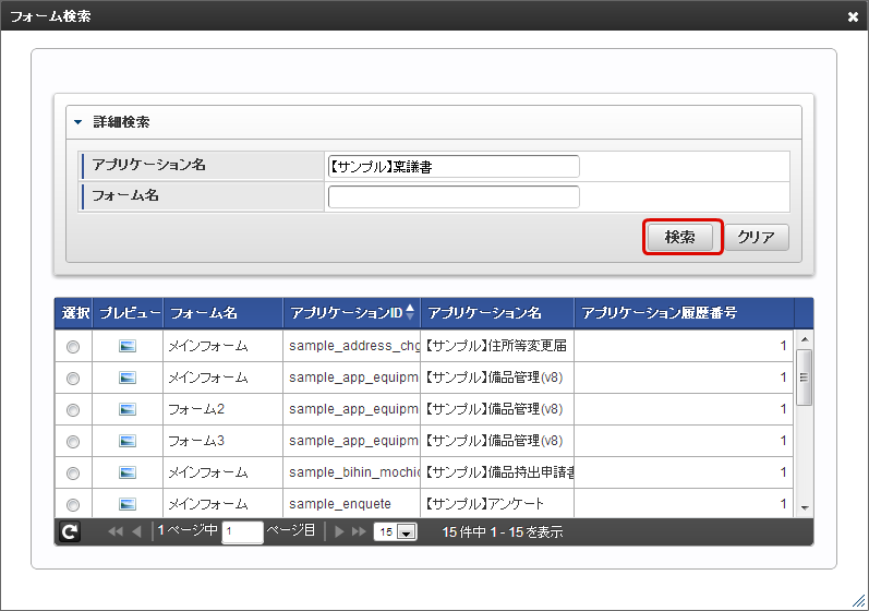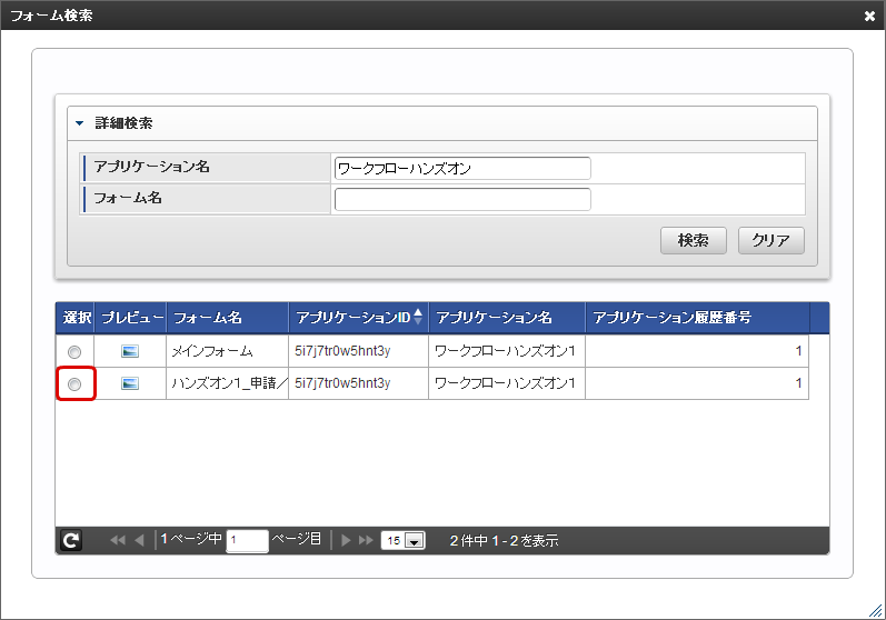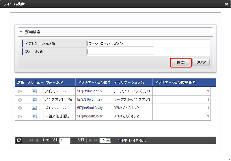 「フォーム検索」画面で「アプリケーション名」にコピー元としたいフロー名を入力して、「検索」をクリックします。