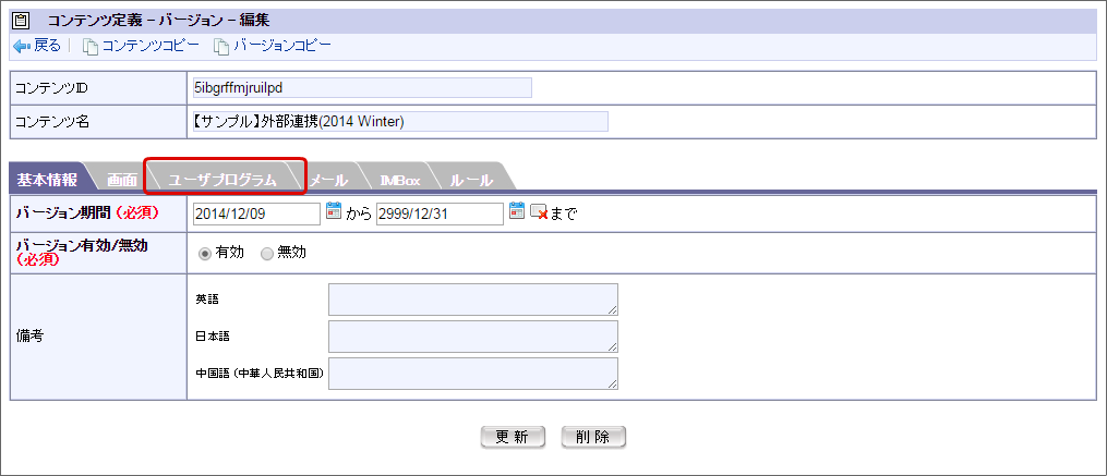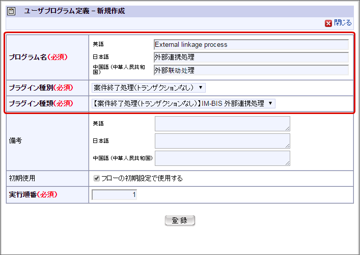以下の図の通りにユーザプログラムを設定し、「登録」をクリックします。以下に示している設定項目以外については、任意に設定してください。以上で、案件終了時に外部連携を実行するための設定が完了しました。