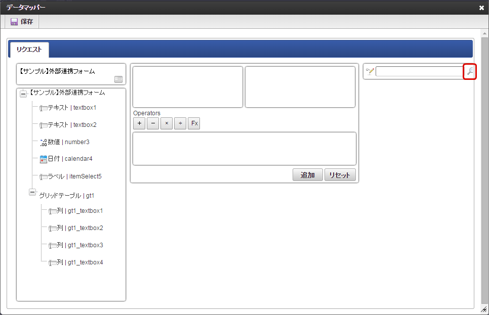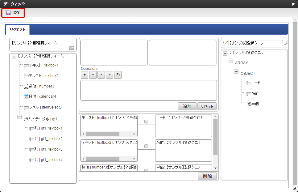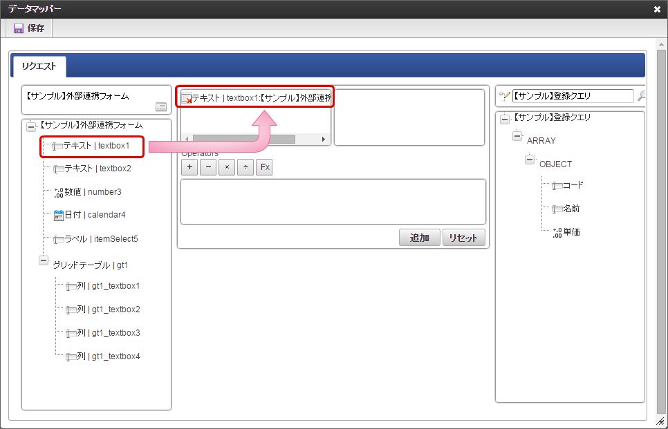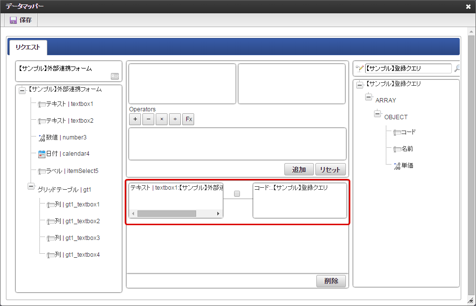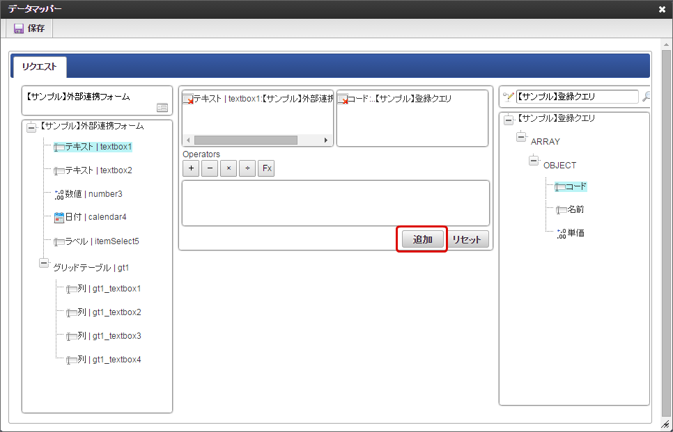 右側のツリーから項目をクリックすると、マッピング対象の枠に追加されます。