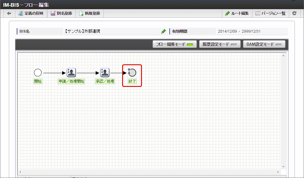 IM-BIS 2014 Winter以前のバージョンで作成したフローに、案件終了のタイミングで外部連携を設定する場合、以下の操作を追加で行う必要があります。