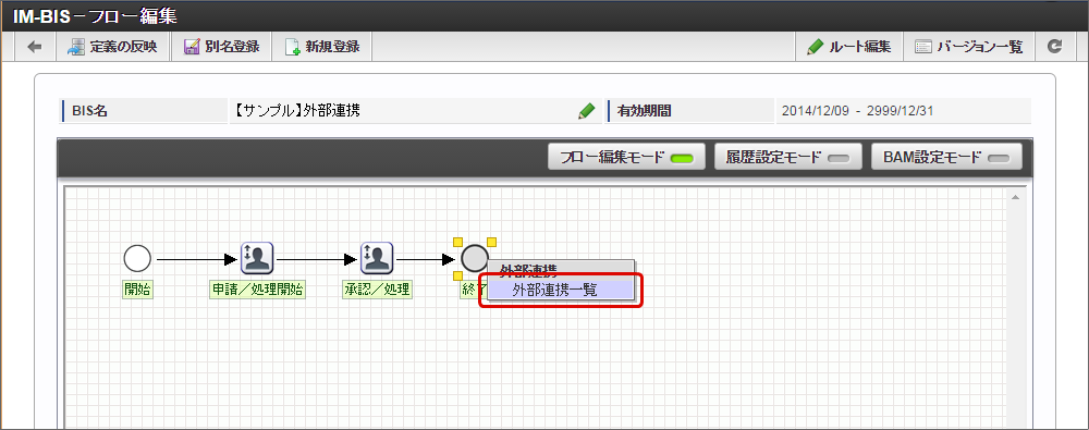「IM-BIS - フロー編集」画面を表示します。終了ノードを右クリックし、「外部連携」-「外部連携一覧」をクリックします。