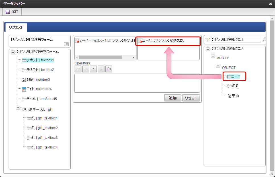 左側のツリーから項目をクリックすると、マッピング対象の枠に追加されます。