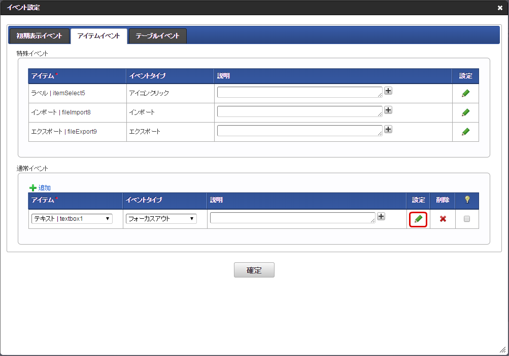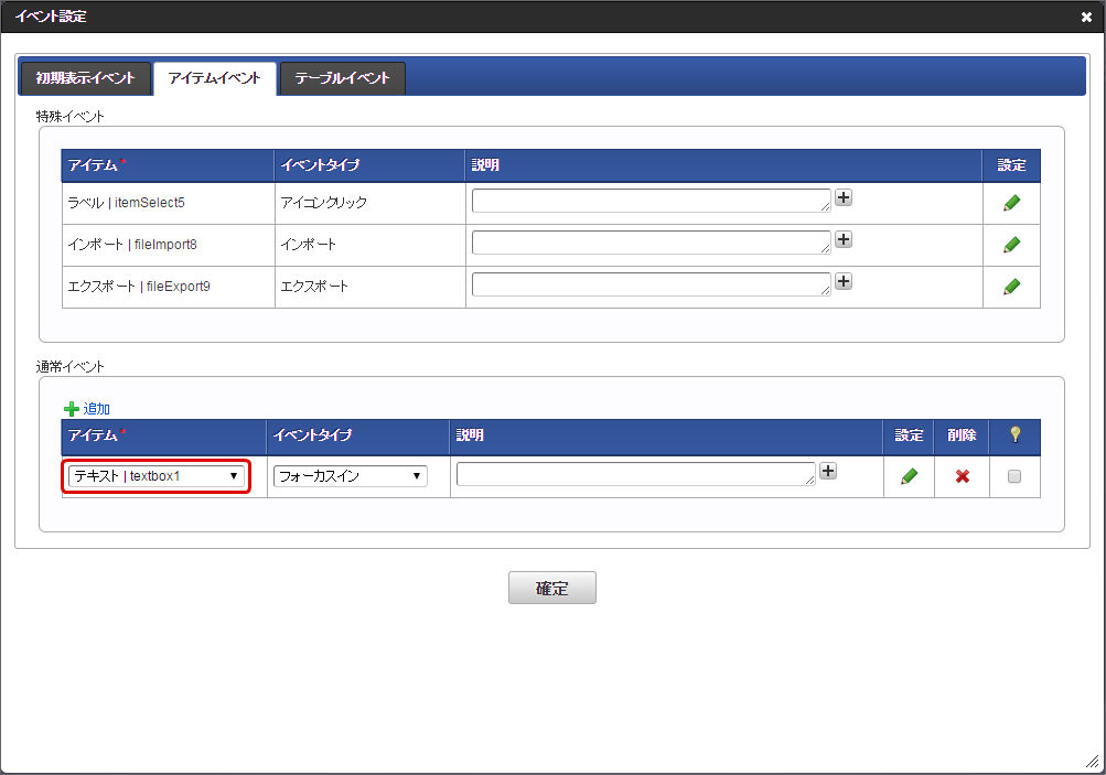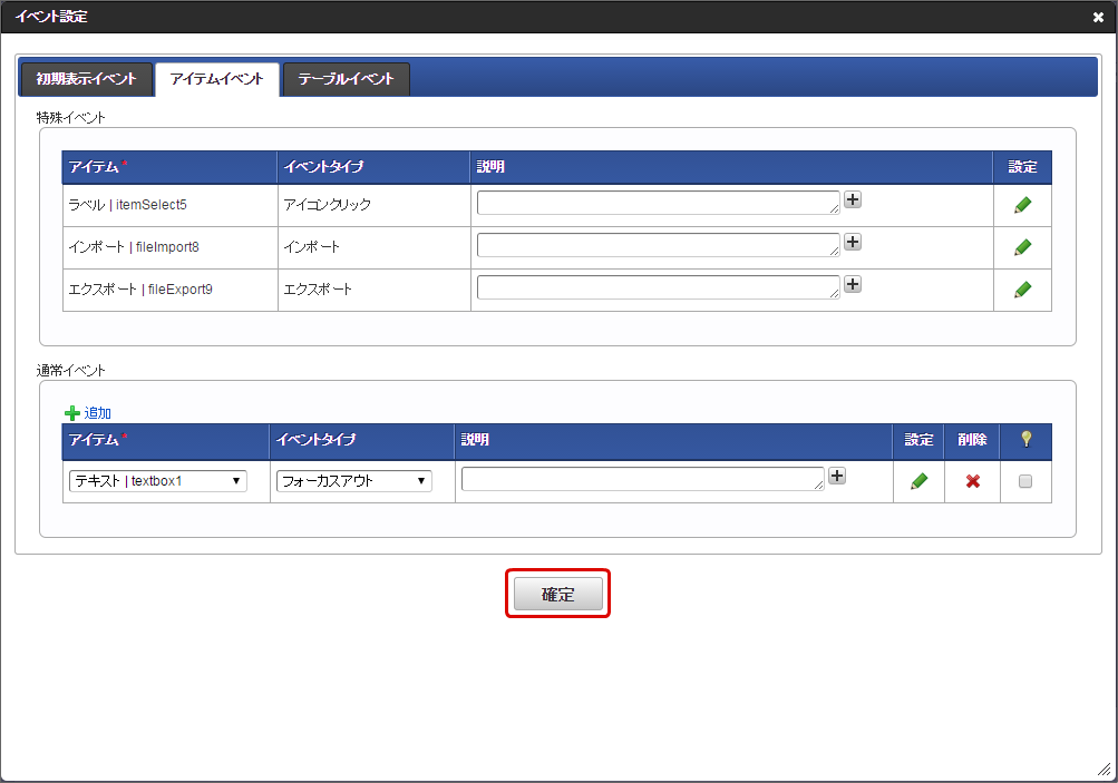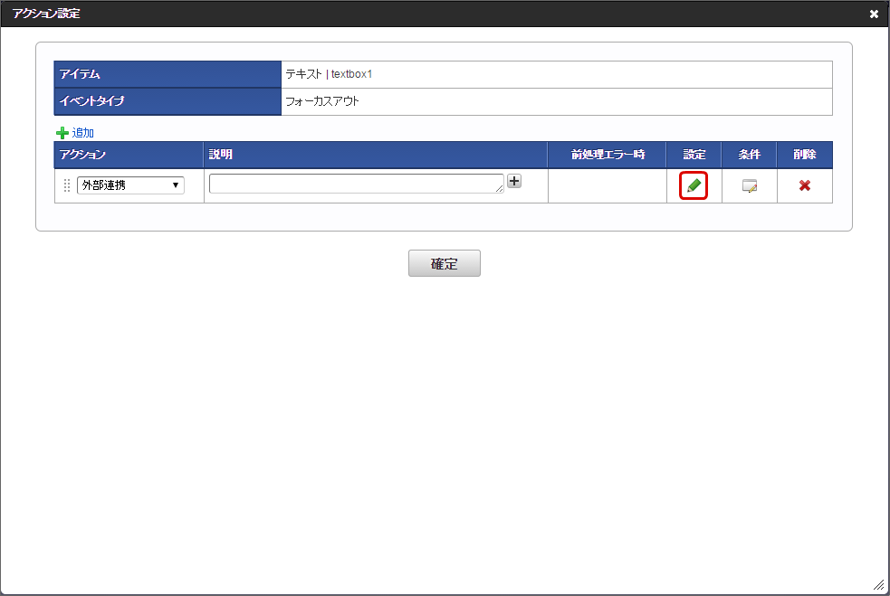 アクション設定に追加されますので、必要に応じて説明を入力し、「確定」をクリックします。