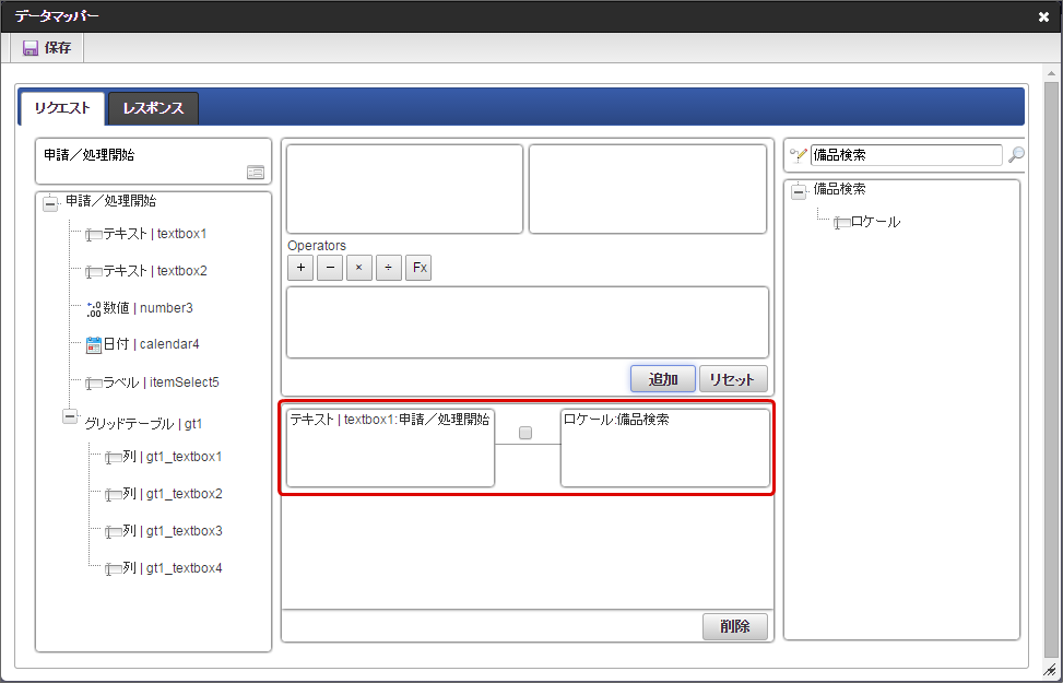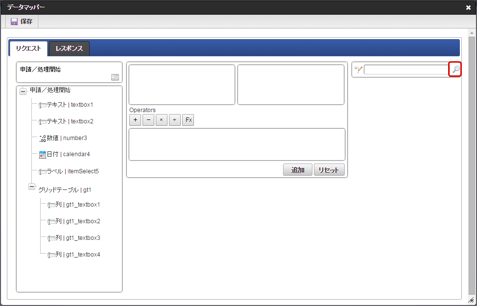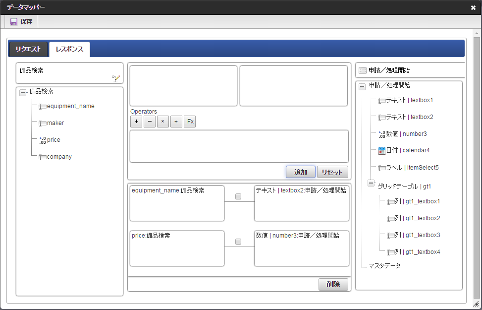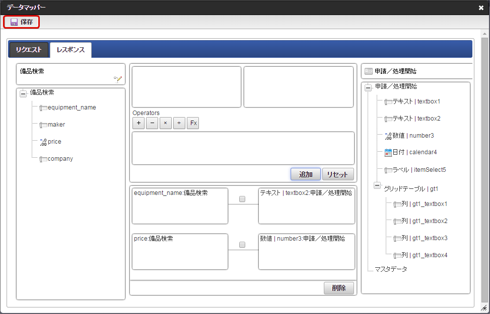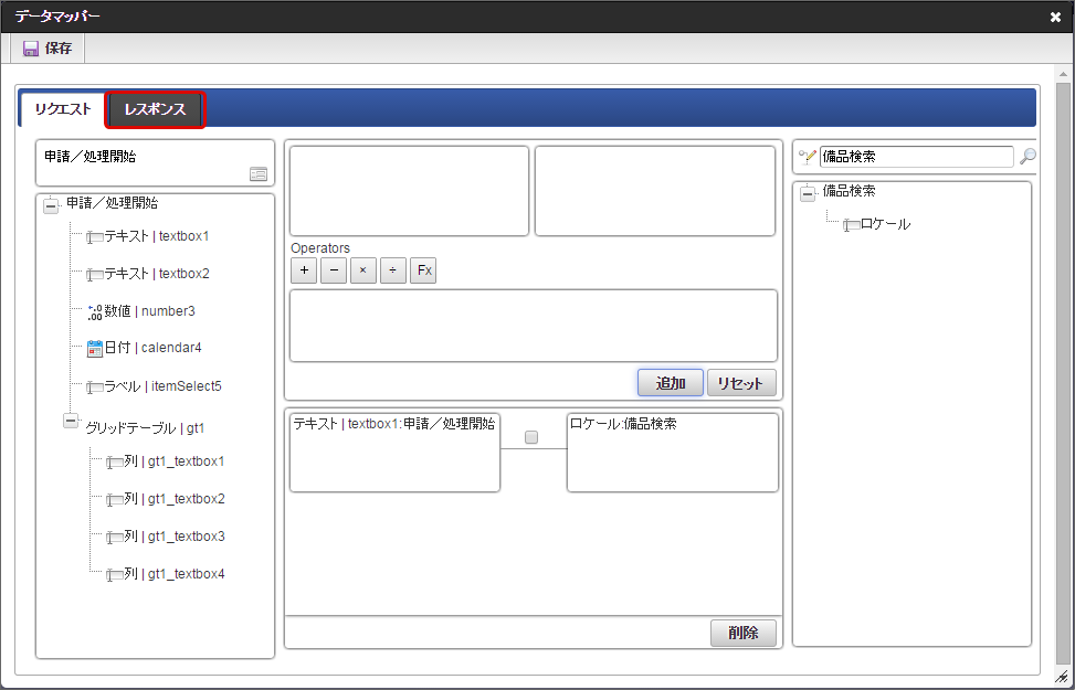 「データマッパー」画面の「レスポンス」をクリックします。