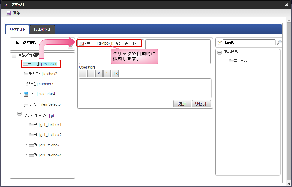 右側のツリーから項目をクリックすると、マッピング対象の枠に追加されます。