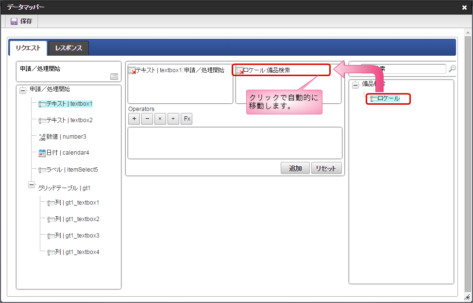 左側のツリーから項目をクリックすると、マッピング対象の枠に追加されます。