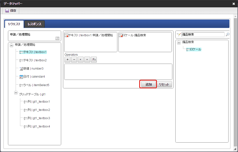 トリガーとなるイベントが対象のテーブル系アイテム以外(別に配置したボタンや文字列アイテムのクリックなど)の場合、外部連携で取得したデータはテーブルの列・行全体に反映されます。 トリガーとなるイベントが対象のテーブル系アイテムの列に対するイベント列のアイコンクリックなど)の場合、外部連携で取得したデータはイベントを発生させた行にのみ反映されます。イベントを発生させたアイテムのある行以外のデータは影響を受けません。トリガーとなるイベントと外部連携の反映先の両方がテーブル系アイテムであっても、同じテーブル系アイテムではなく、テーブル識別IDが異なる場合には、1.のケースとして扱います。そのため、外部連携で取得したデータは、反映先のテーブルの列・行全体に反映されます。「追加」をクリックします。