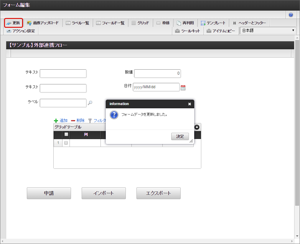 「イベント設定」画面に戻り、「更新」をクリックします。「フォーム・デザイナ」画面に戻り、「更新」をクリックします。
