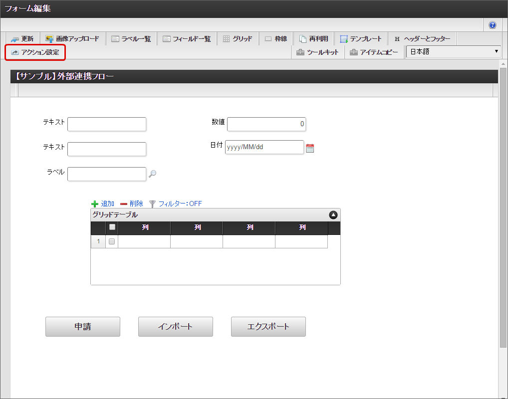 画面の作成後、ツールバーの「アクション設定」をクリックします。