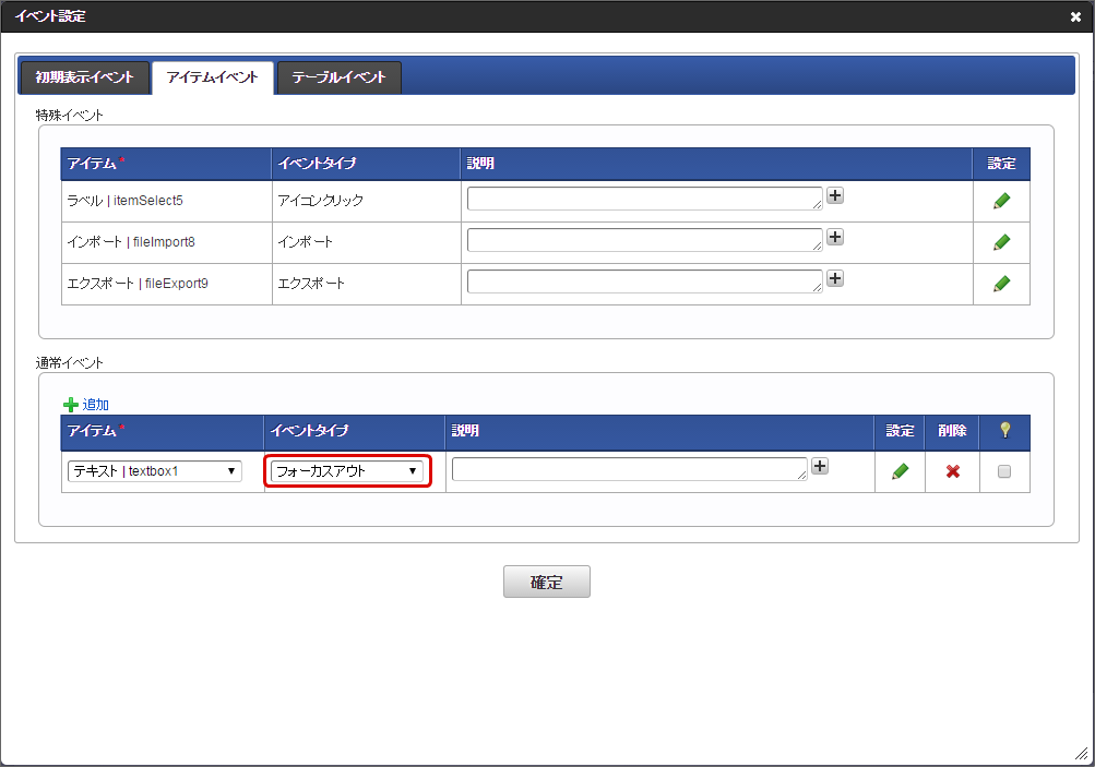 イベント種別 イベントタイプ 説明 通常イベント フォーカスイン 入力フィールドにフォーカスが合わせられたときに外部連携を実行します。 入力 入力フィールドの値が変更され、フォーカスが外れたときに外部連携を実行します。カレンダー選択により、選択日が反映されたときも同様です。クリック 入力フィールド、ボタン、アイコンをクリックしたとき、外部連携を実行します。 フォーカスアウト 入力フィールドからフォーカスが外れたときに外部連携を実行します。 特殊イベント アイコンクリック インポート インポートボタン用のイベントです。ボタンをクリックしたとき、外部連携を実行します。エクスポート エクスポートボタン用のイベントです。ボタンをクリックしたとき、外部連携を実行します。コラム