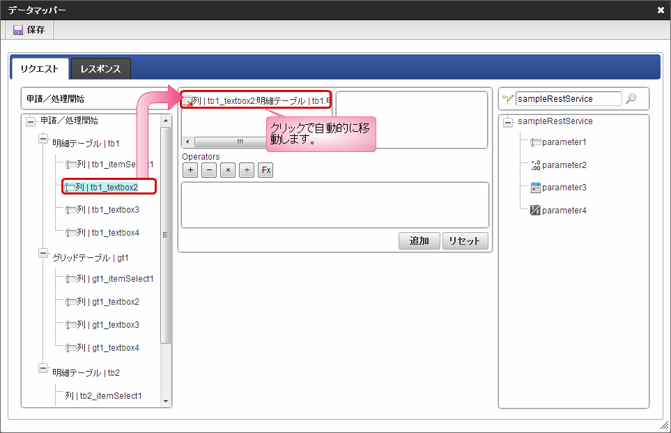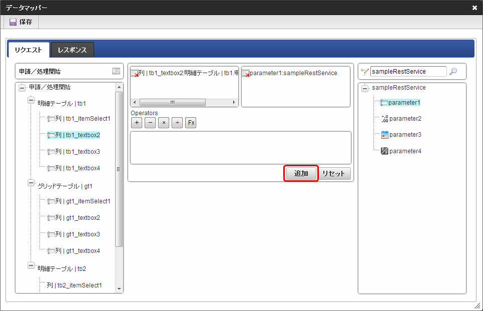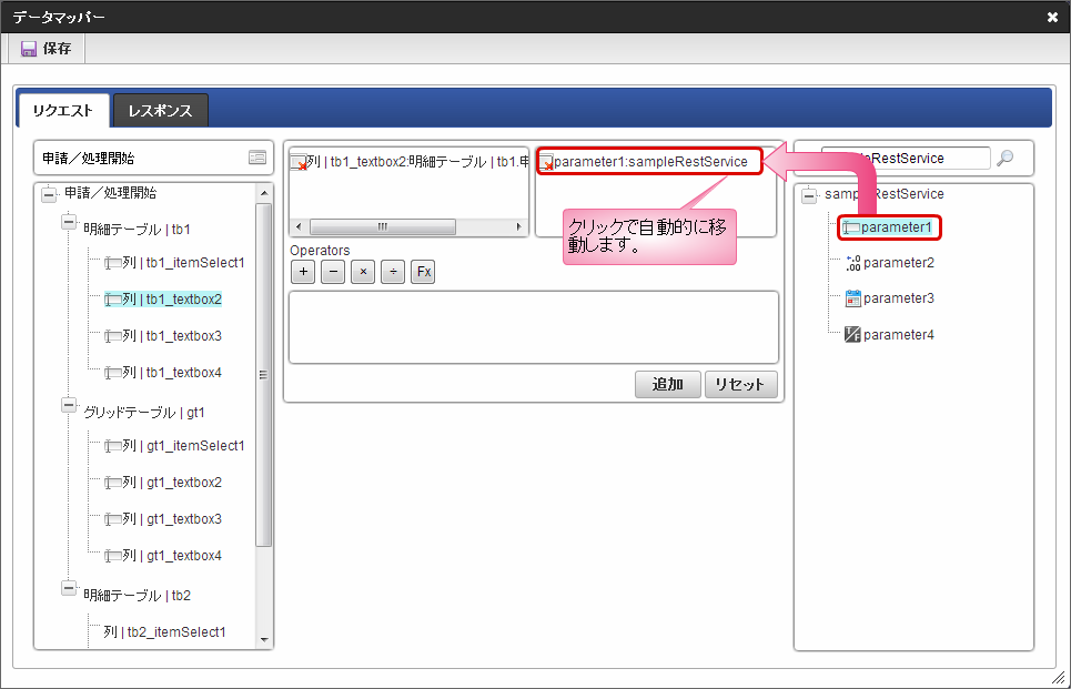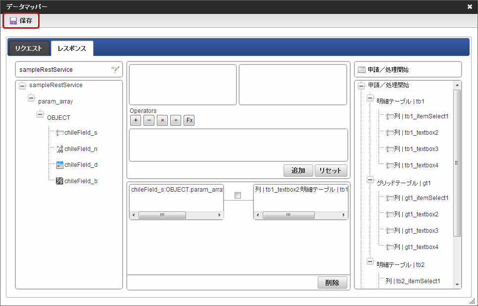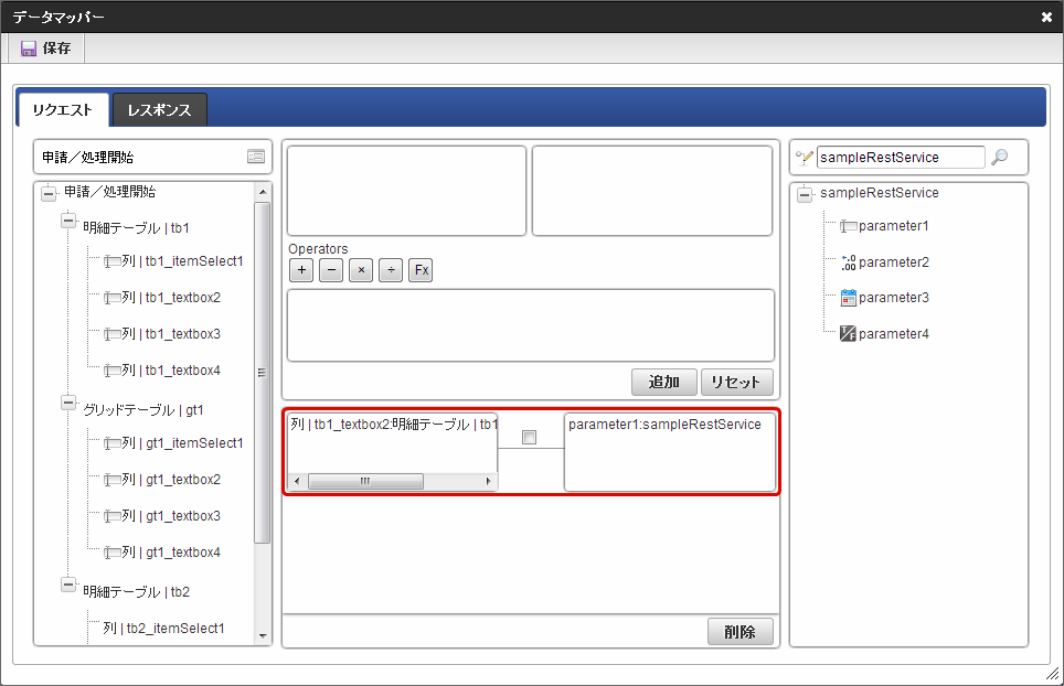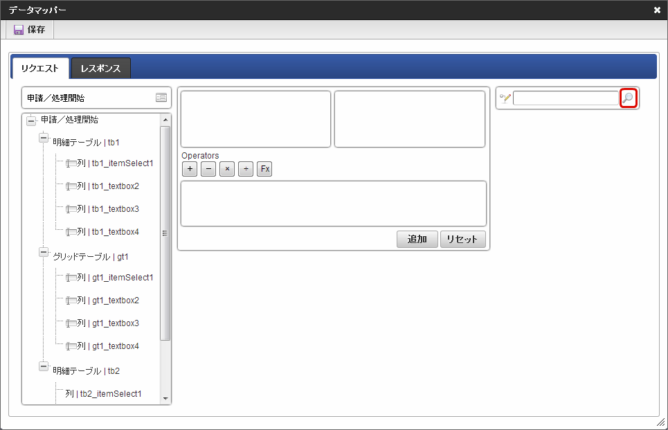 「データマッパー」画面の「リクエスト」で、右のデータソース定義を検索するために