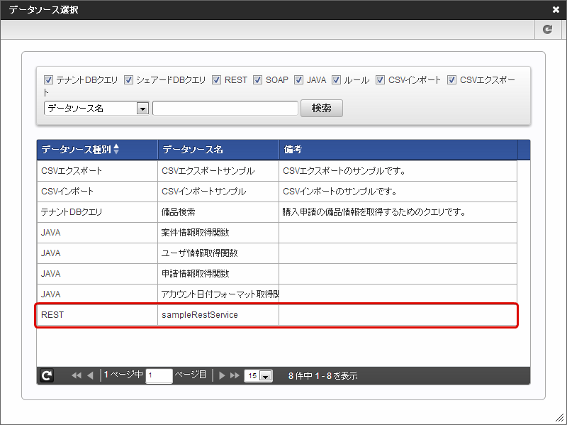 登録済みのデータソース定義から利用するものをクリックして選択します。