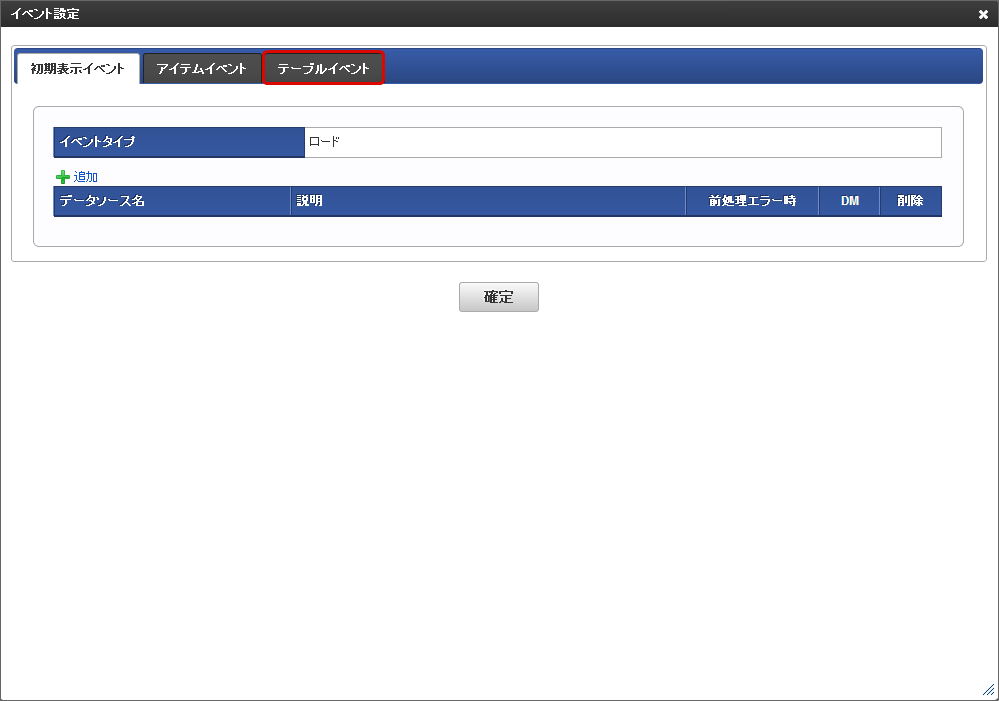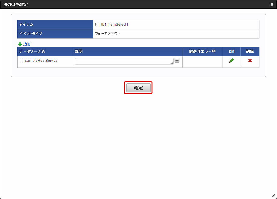 特殊イベントとは、画面アイテムに特化した外部連携を実行するイベントです。一覧選択ダイアログを呼び出したり、入力情報とCSVファイルを連携するといった、通常イベントにはない外部連携を実行します。特殊イベントでは、選択できるデータソース定義やデータマッパーの構造など、一部に制限がある場合があります。「外部連携設定」画面で「追加」をクリックします。