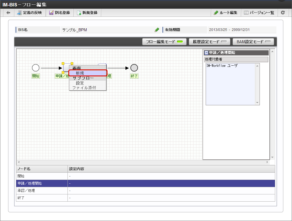 対象のタスク(ノード)をダブルクリック、または、右クリックし「画面」→「新規」(登録済みの場合は「開く」)をクリックして「フォーム・デザイナ」画面で画面を設定します。