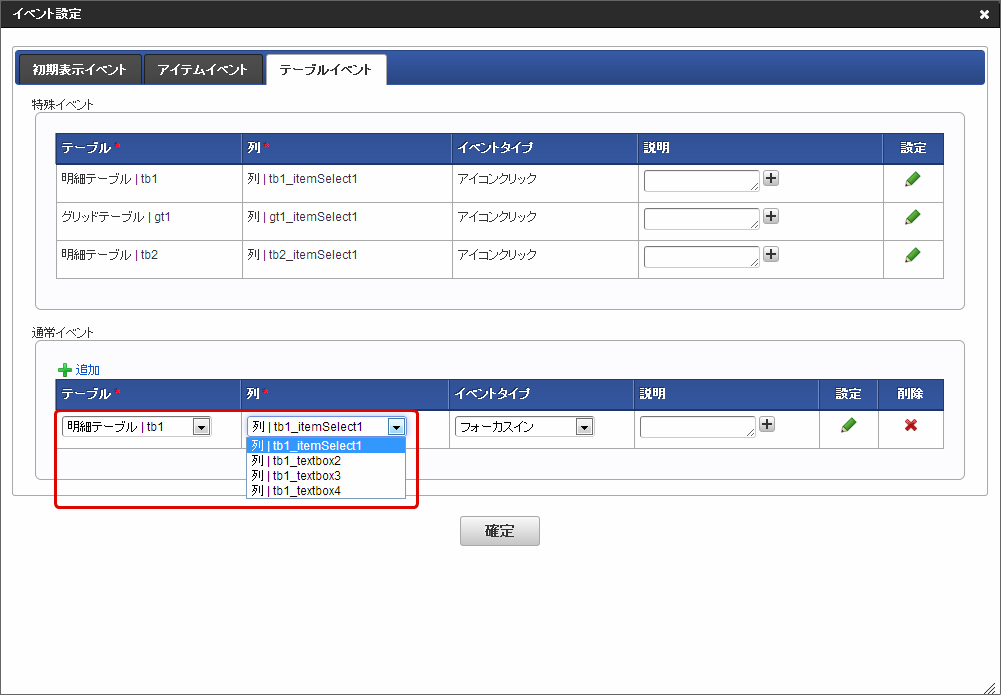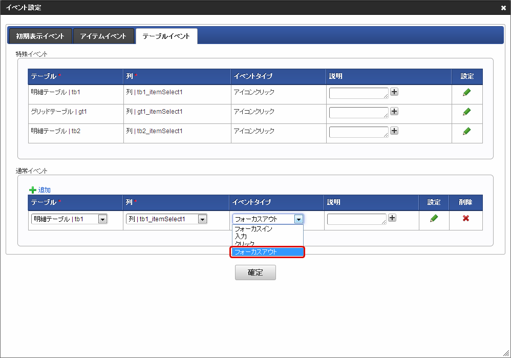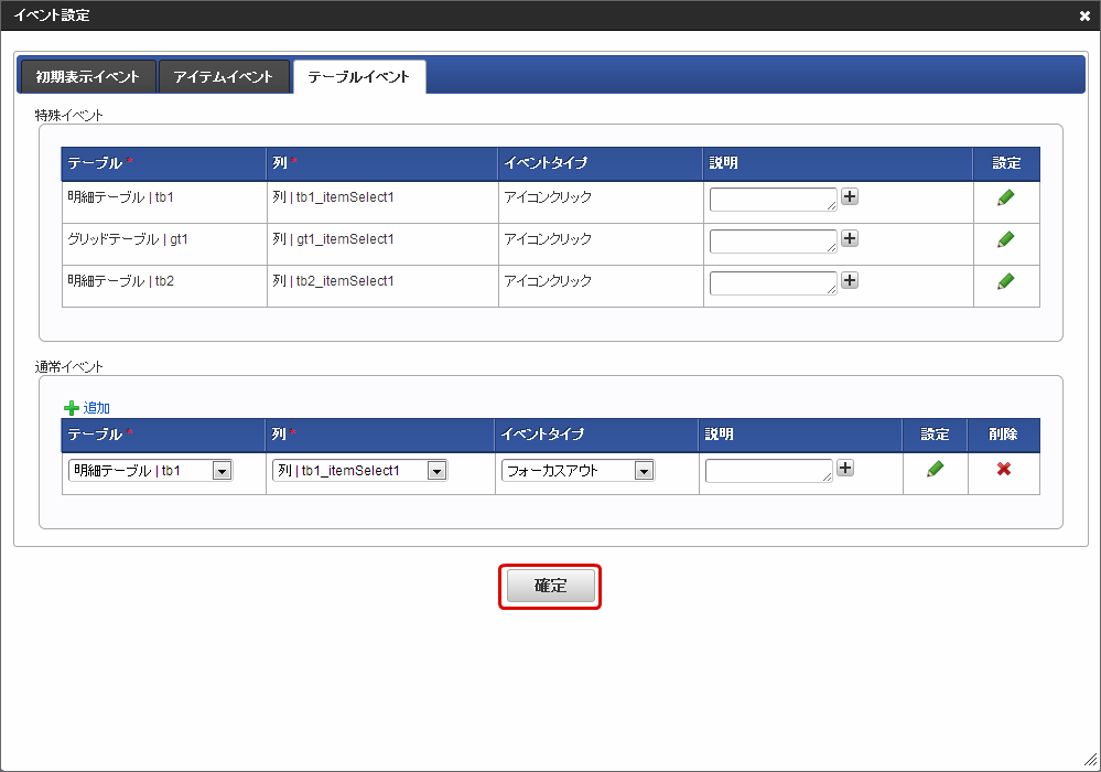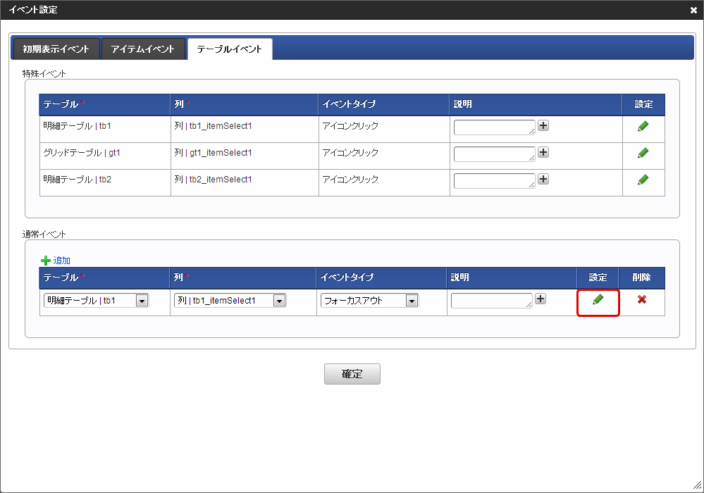 「イベント設定」画面に戻ります。「特殊イベント」も同様に設定し、「確定」をクリックします。「フォーム・デザイナ」画面に戻り、「更新」をクリックします。