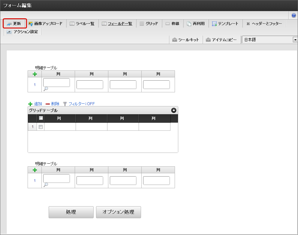 外部連携で取得したデータとフォームの項目間での連携を、画面上の明細テーブル・グリッドテーブルの特定の項目(列)への操作(イベント)のタイミングで行うためには、以下の手順で設定します。