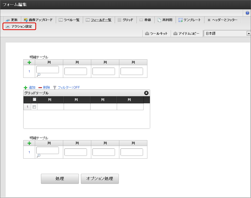 連携を行う画面アイテム(明細テーブル)を配置後に、ツールバーの「アクション設定」をクリックします。