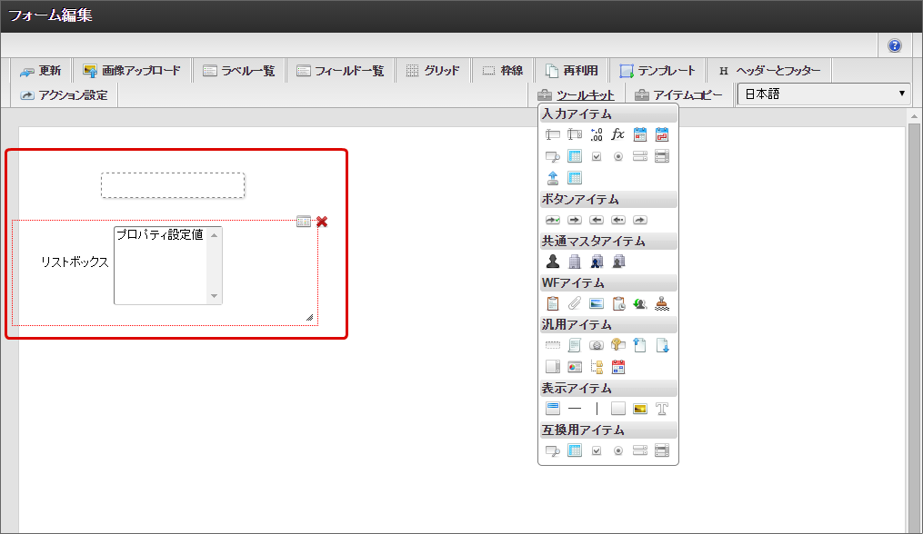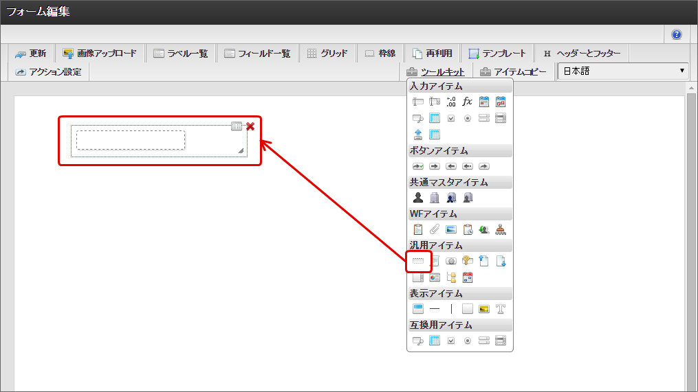 「フォーム・デザイナ」画面で「ツールキット」から外部連携で値を設定する画面アイテムを配置します。