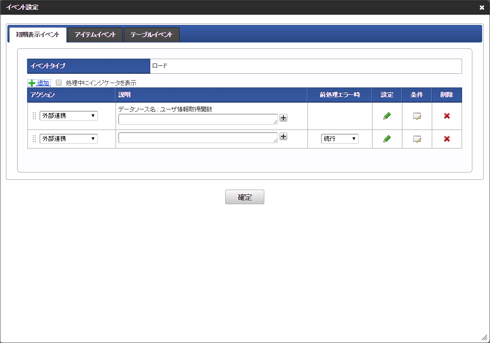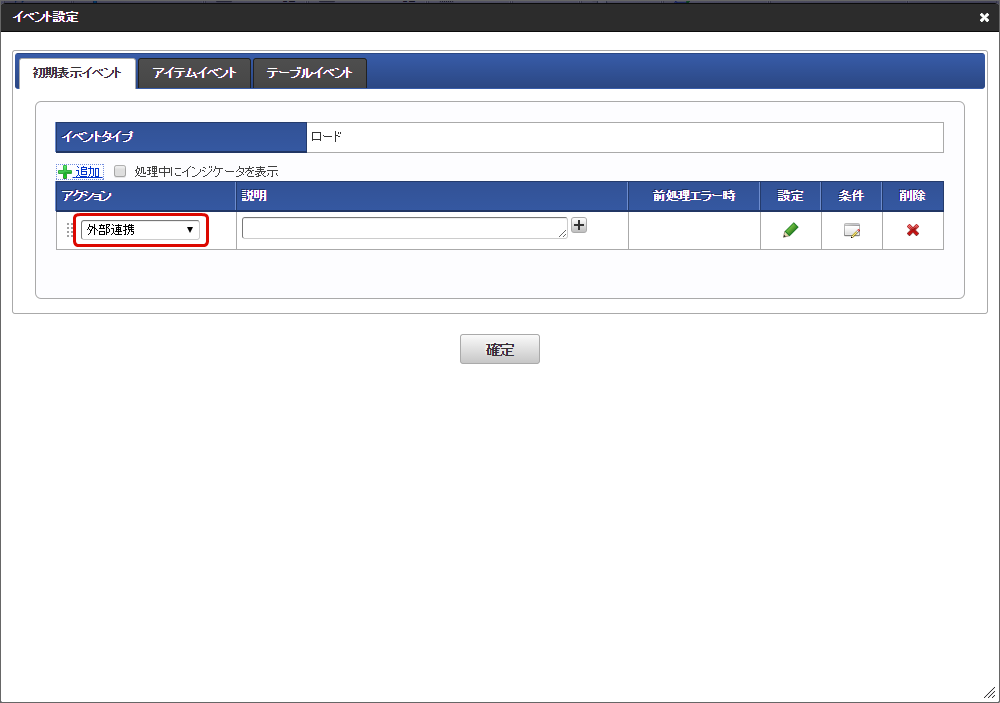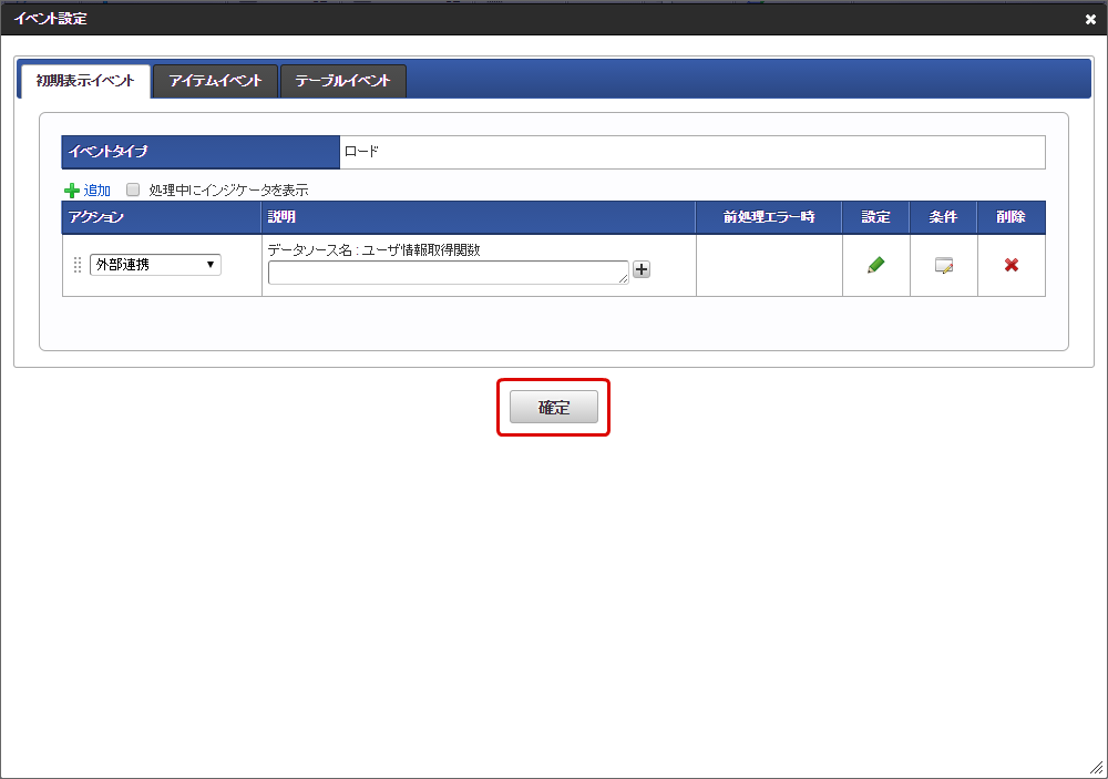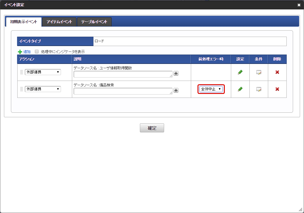 最初に設定した関数の外部連携がエラーとなる場合には、後続の外部連携処理が正しく行えないため、画面アイテムに値を設定する連携処理の「前処理エラー時」を「全体中止」に変更します。