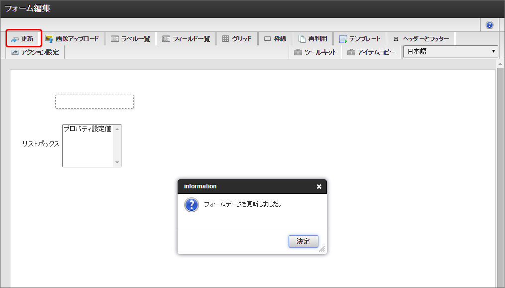 これで、「更新」をクリックして画面を保存すると、外部連携のデータソース定義と連携した画面アイテムの設定が完了します。