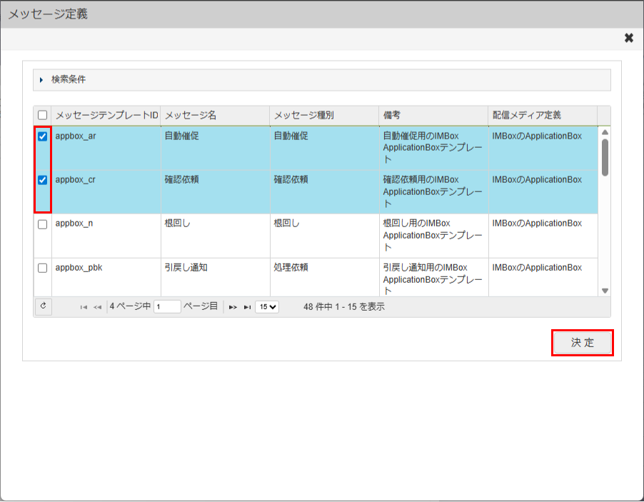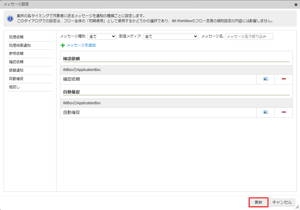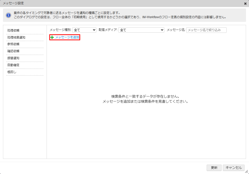 「メッセージ設定」で、案件の各タイミングで対象者に送る通知を設定するには、以下の手順で設定します。
