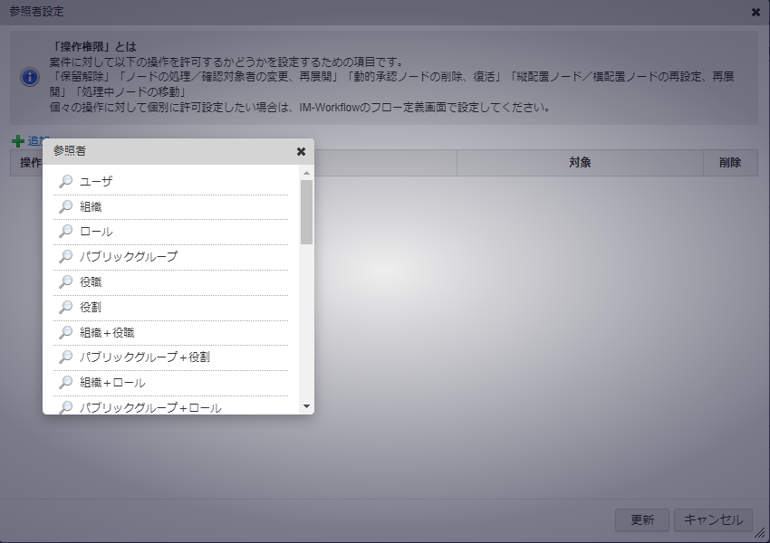 「追加」ボタンをクリックして、参照者を設定します。 参照者にはユーザだけでなく、組織などのグループも設定できます。