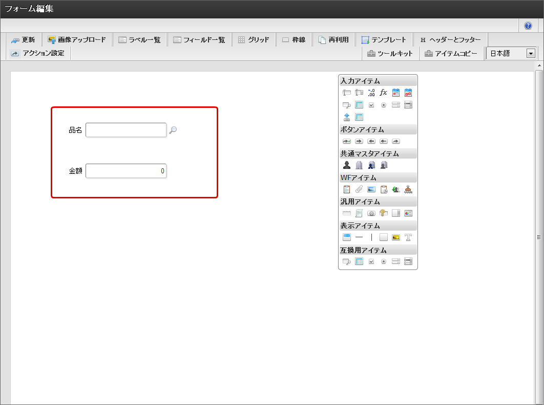 「フォーム・デザイナ」画面で「ツールキット」から一覧選択を含む複数の画面アイテムを配置します。