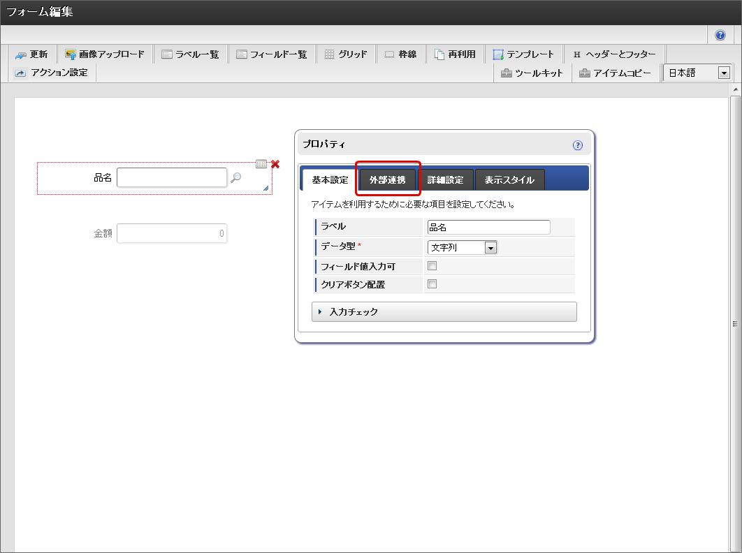 画面アイテムのプロパティで「外部連携」をクリックします。