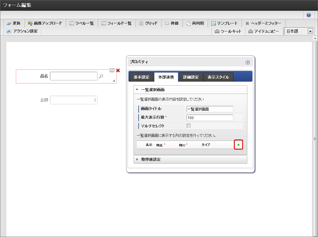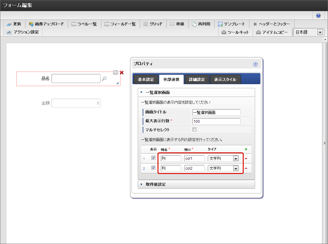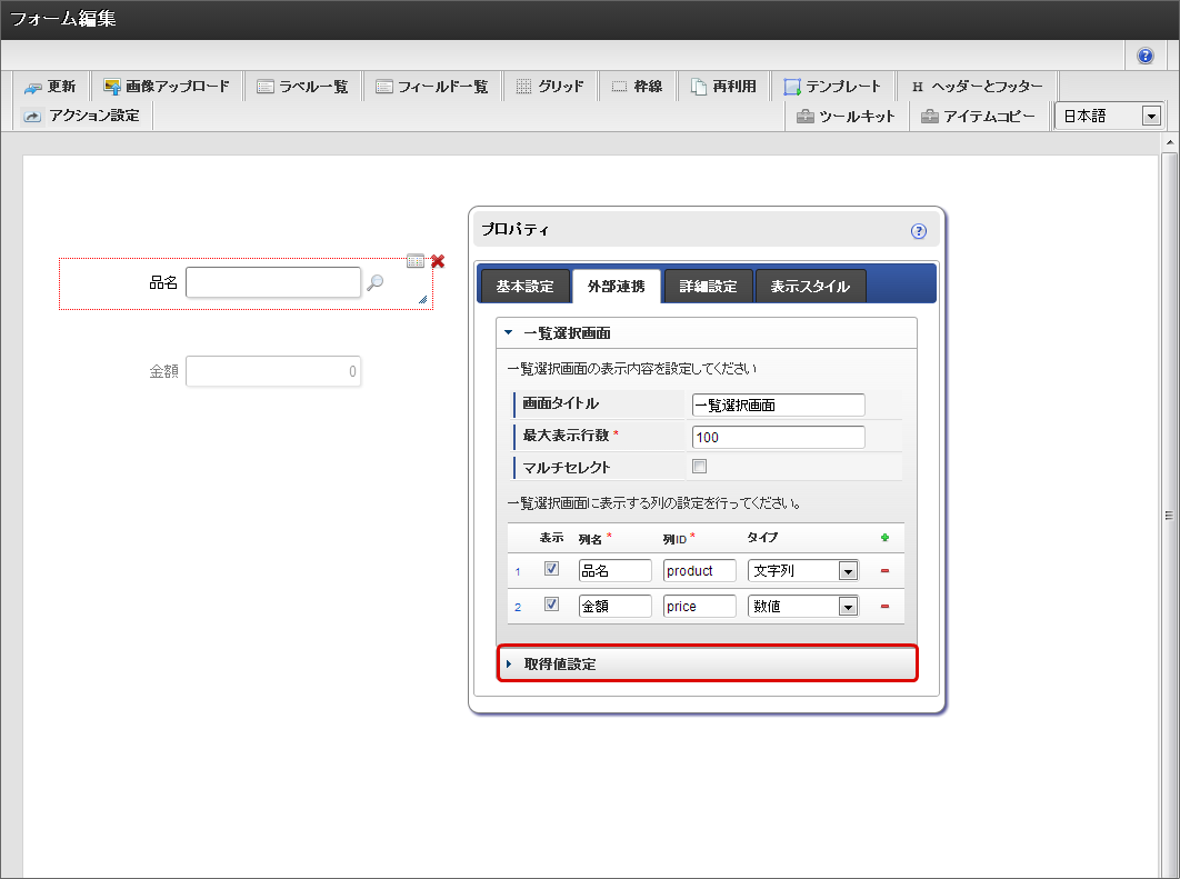 一覧選択の取得値設定は、原則として画面作成の最後に実施してください。フィールド識別IDとデータ型が決定した後でないと、実行処理における整合性が保持できず、動作を保証できません。その場合、再度取得値を設定すれば解消することができます。