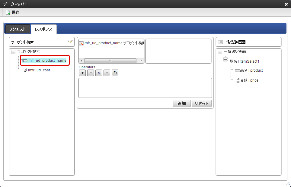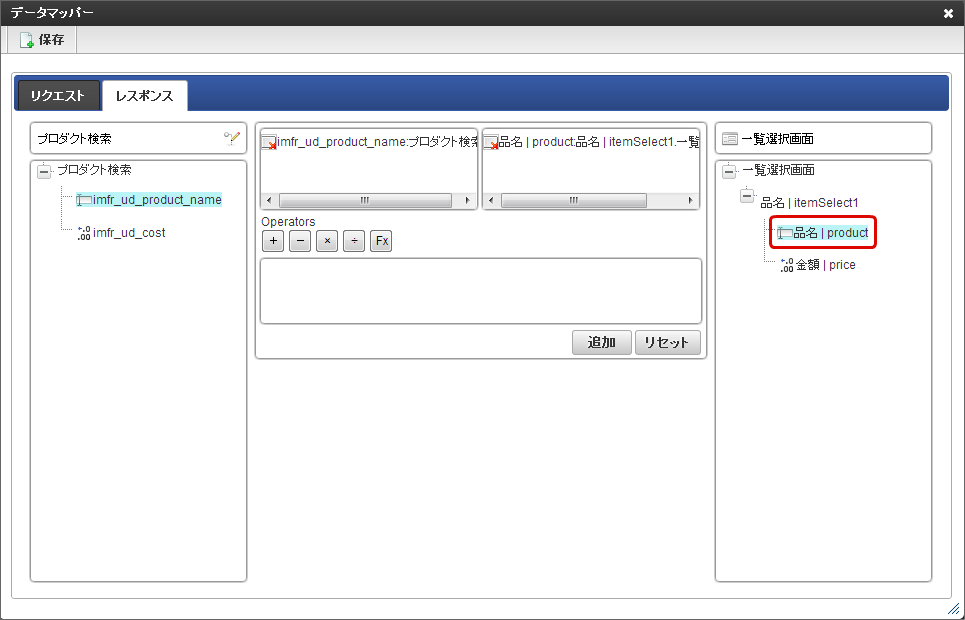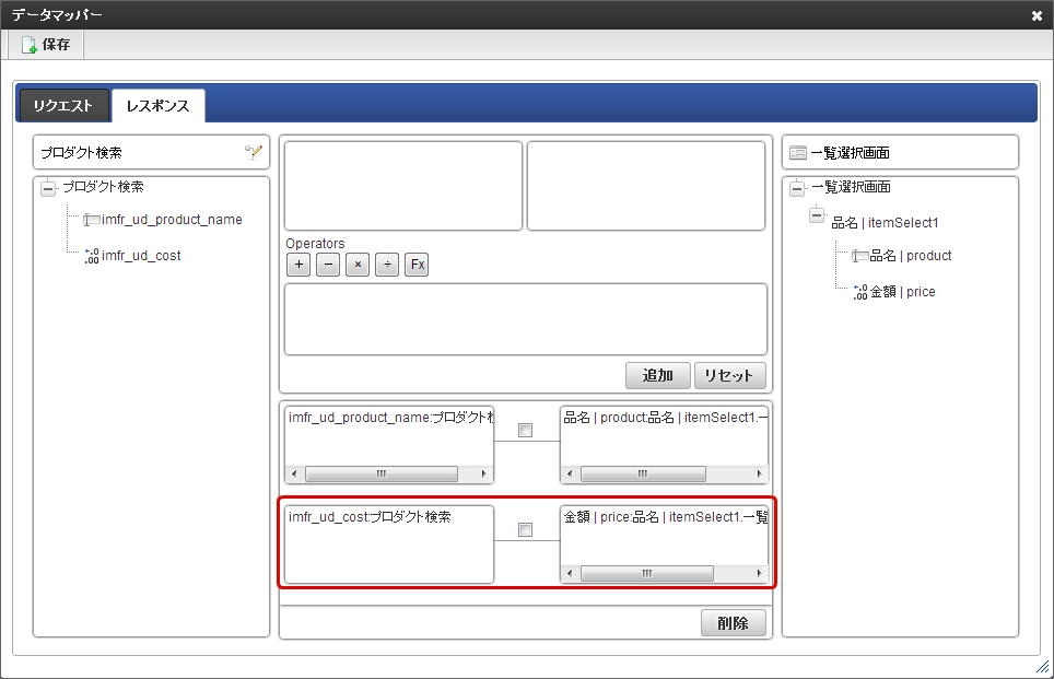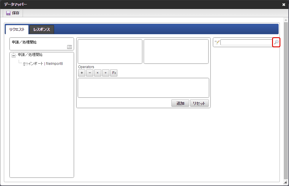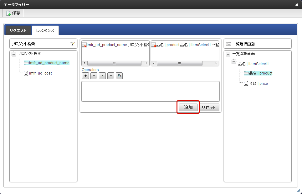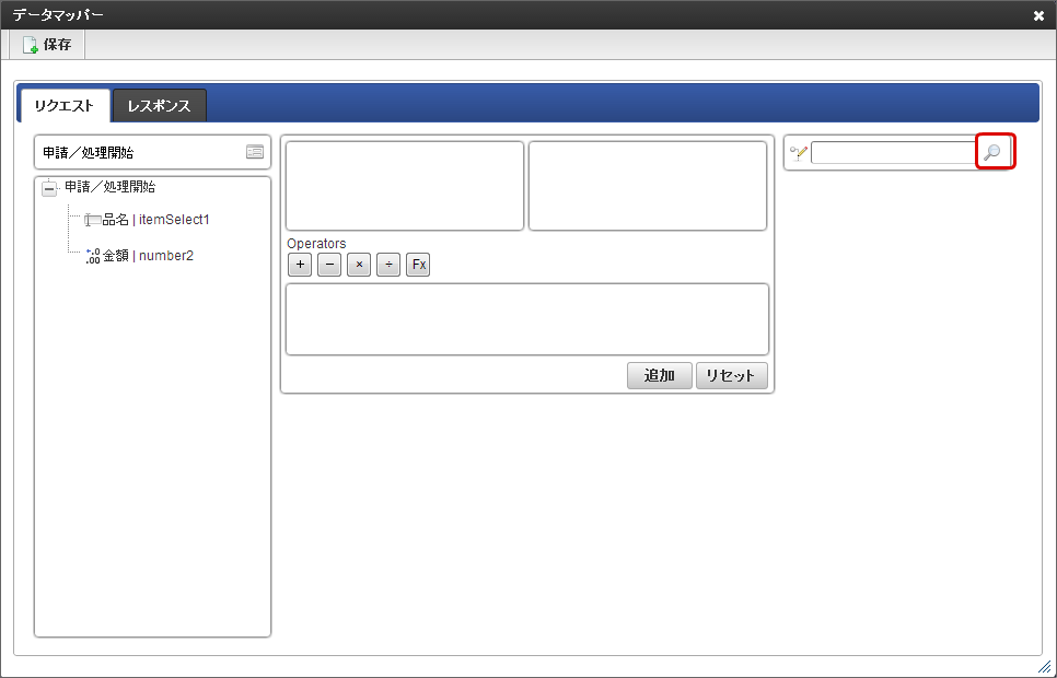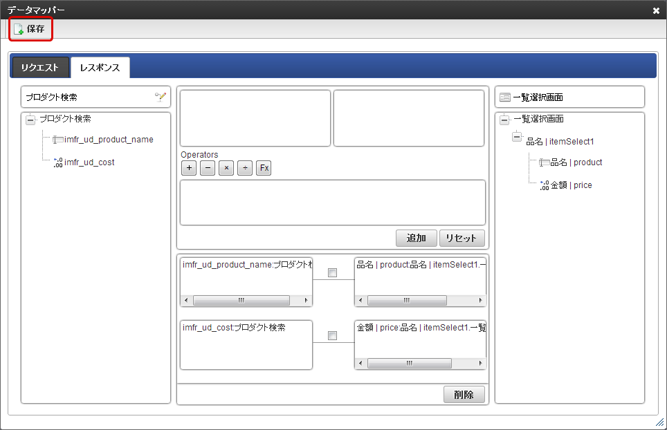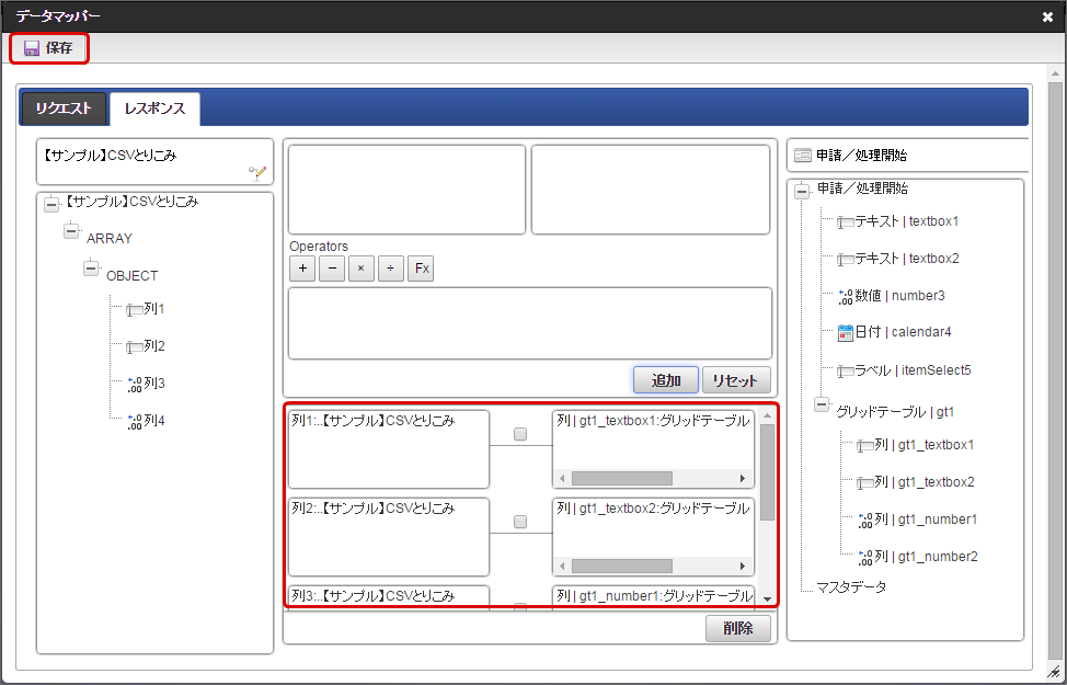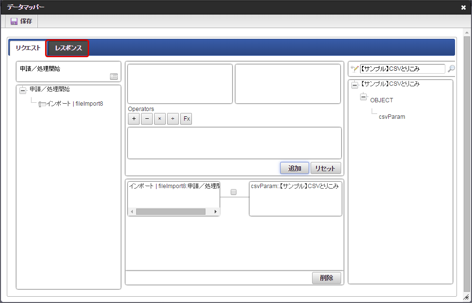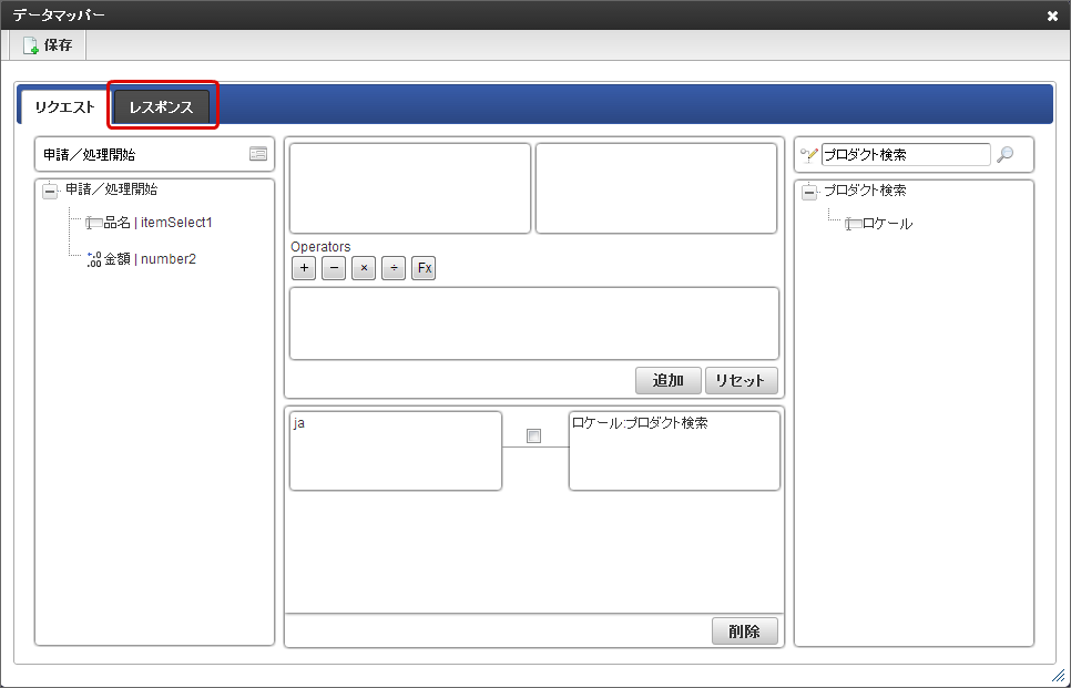 「データマッパー」画面の「レスポンス」をクリックします。