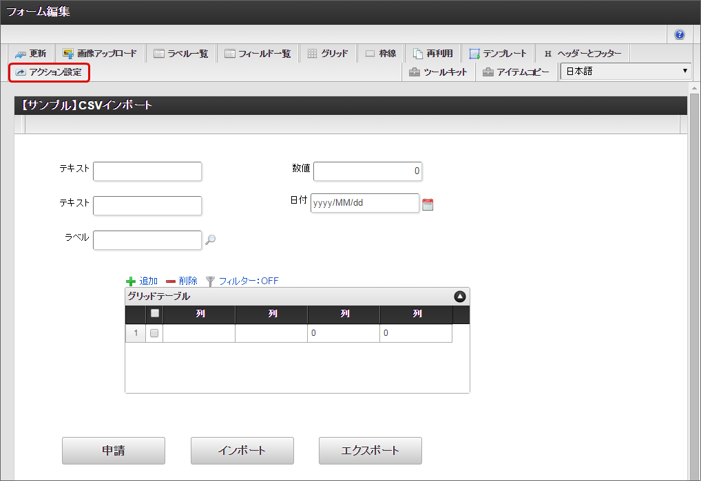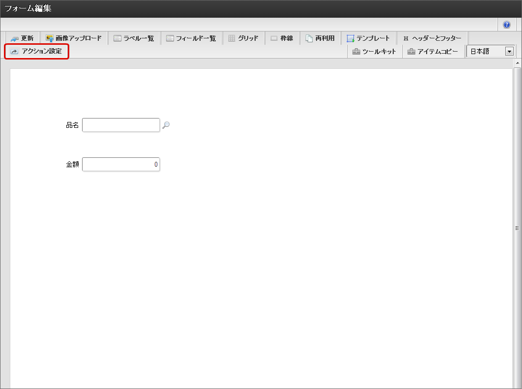 画面の作成後、ツールバーの「アクション設定」をクリックします。