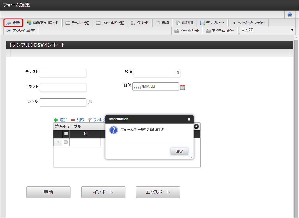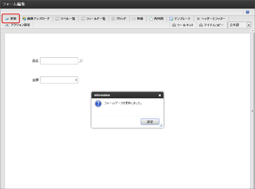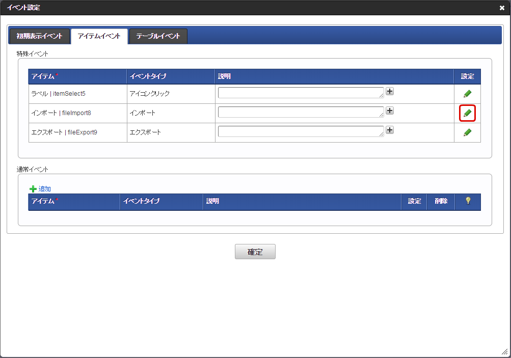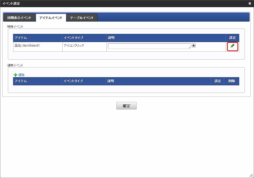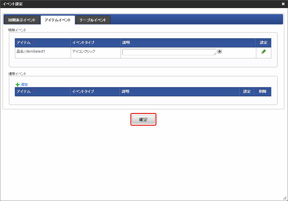 「イベント設定」画面で必要に応じて説明を入力し、「確定」をクリックします。「フォーム・デザイナ」画面に戻り、「更新」をクリックします。