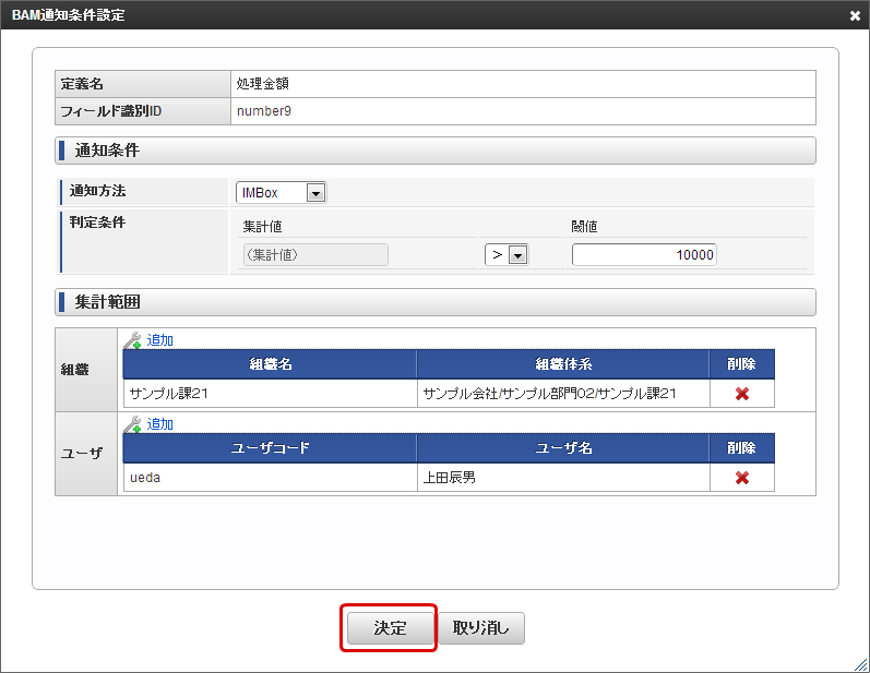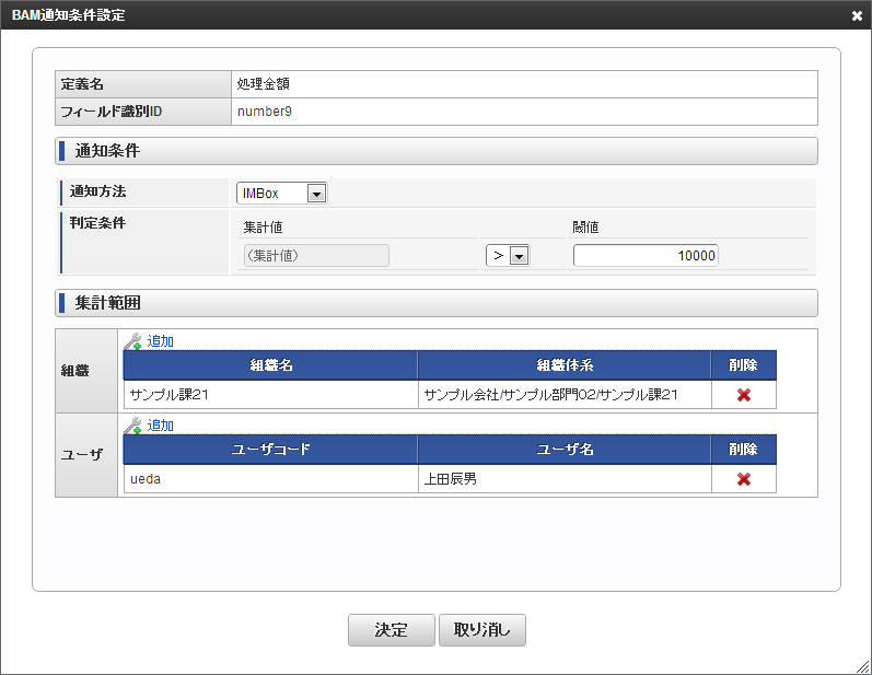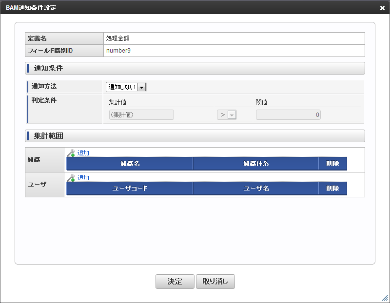 「BAM詳細設定」画面で設定した項目の集計の対象範囲を「集計範囲」に設定します。「追加」をクリックして、集計の対象となる「組織」、「ユーザ」を検索して設定します。通知条件の設定が完了したら、「決定」をクリックします。