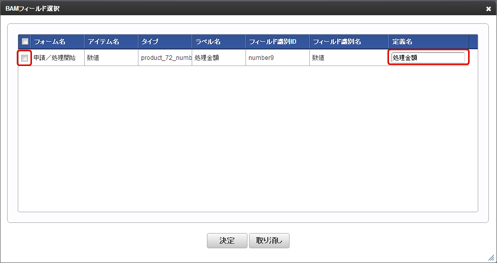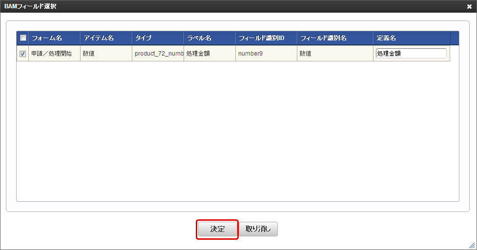 「BAMフィールド選択」画面から追加したい画面の項目のチェックボックスをオンにし、監視条件の名称として「定義名」を入力します。