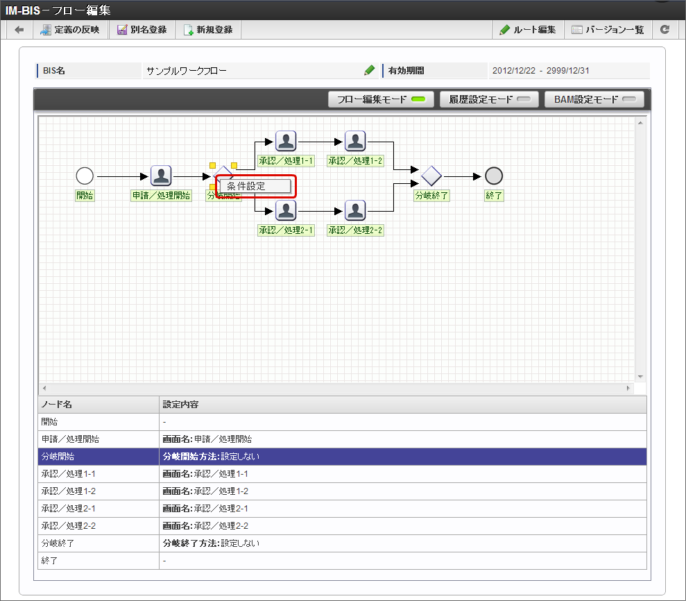 「IM-BIS - フロー編集」画面で、分岐条件を設定する「分岐開始」ノードを右クリックし、「条件設定」をクリックします。