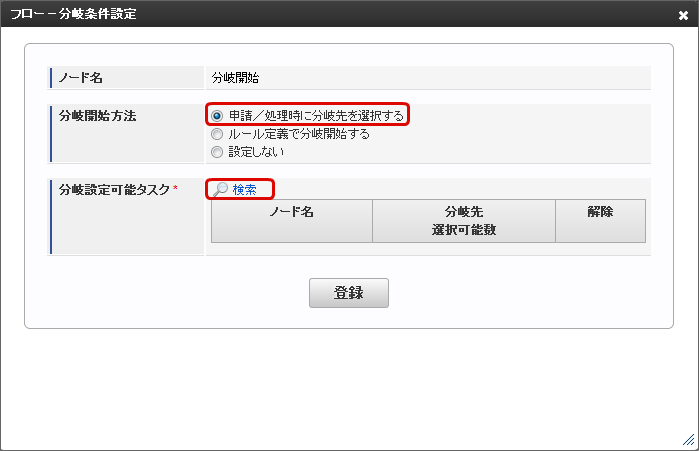 「フロー - 分岐条件設定」画面で、「申請/処理時に分岐先を選択する」を選択し、「検索」をクリックします。